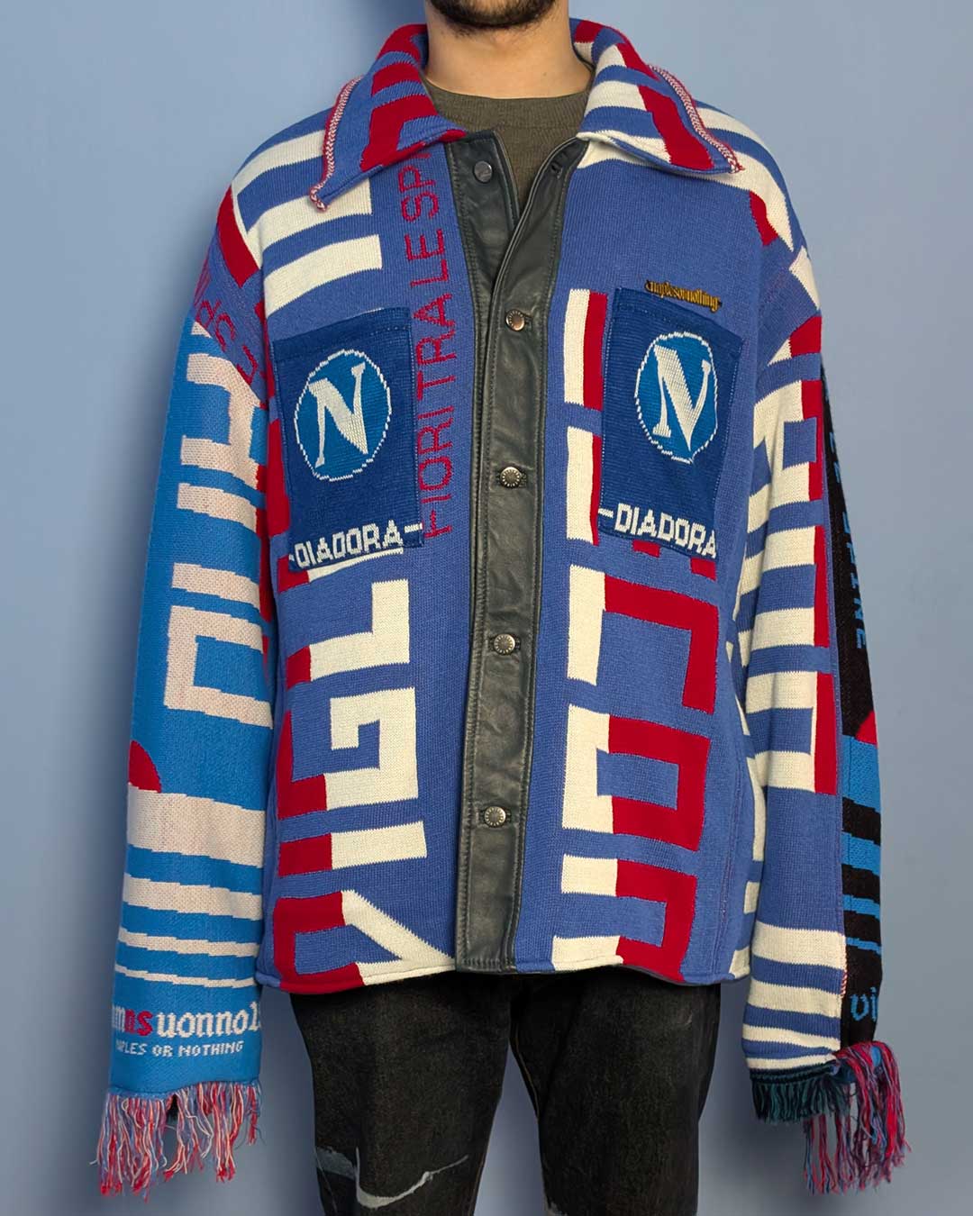 Schott polsini e bordo inferiore in maglia, maniche in tessuto jacquard con scritta "QUARTIERI SPAGNOLI"....
