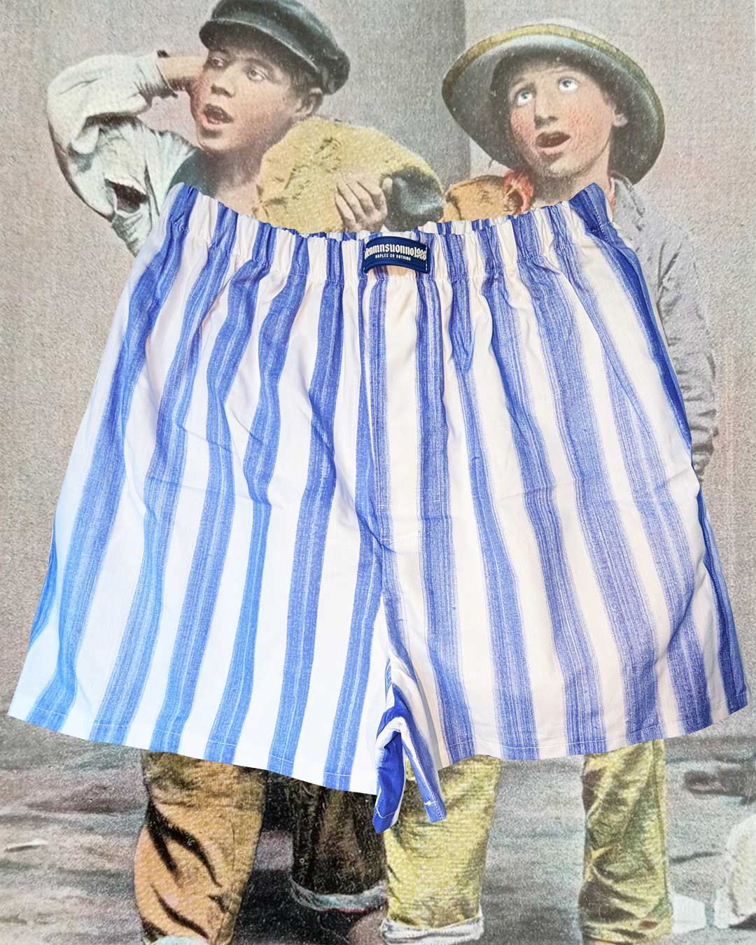 Boxer in mussola di cotone a righe azzurre dipinte a mano con stampa serigrafica "NAPLESORNOTHING"...