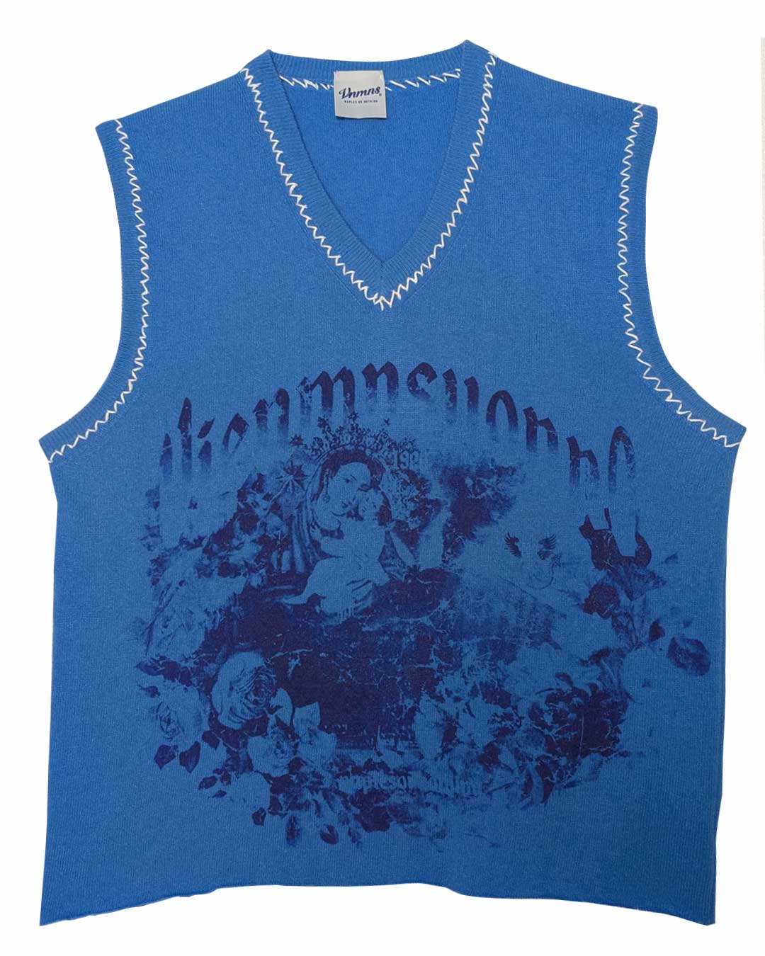 Gilet en laine bleu céruléen avec sérigraphie "Rosemary" en bleu cobalt et broderie à la...