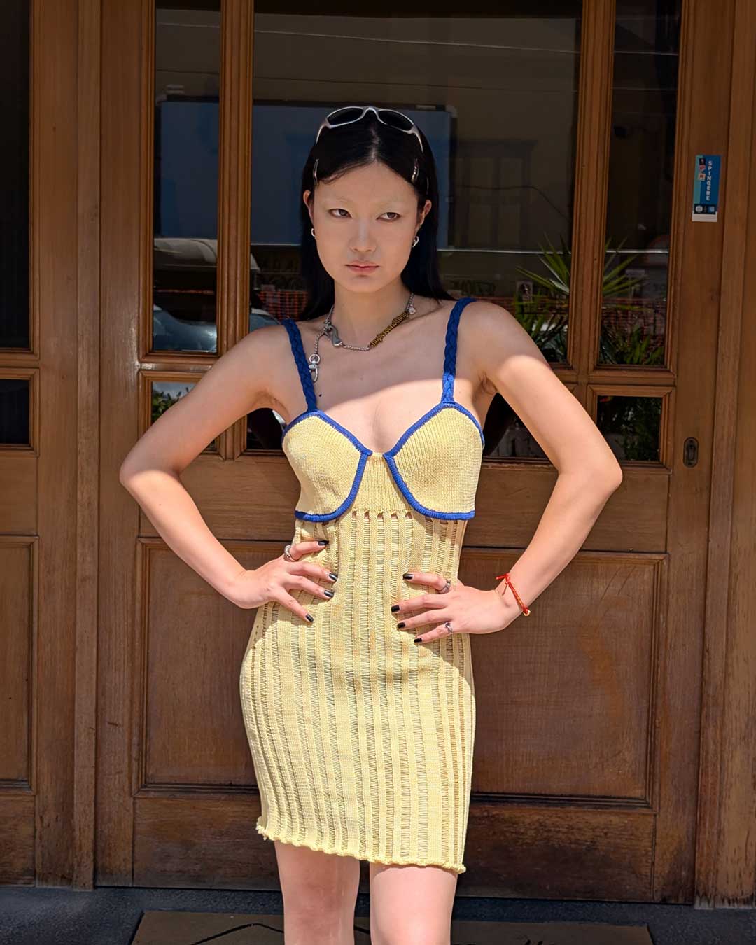 Il giallo tenue della base è arricchito da dettagli in blu a contrasto per le spalline intrecciate e i profili del corpino.