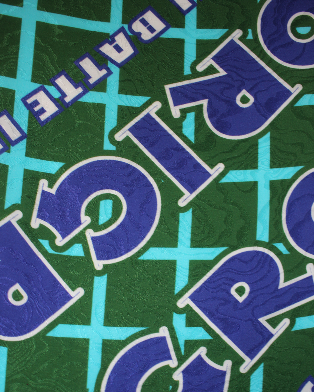 Bandana in seta con lavorazione jacquard moiree stampa all over con fondo verde e logo “FUORIGROTTA mi batte el corazon ” con simboli e claim bianco, celeste e blu.
