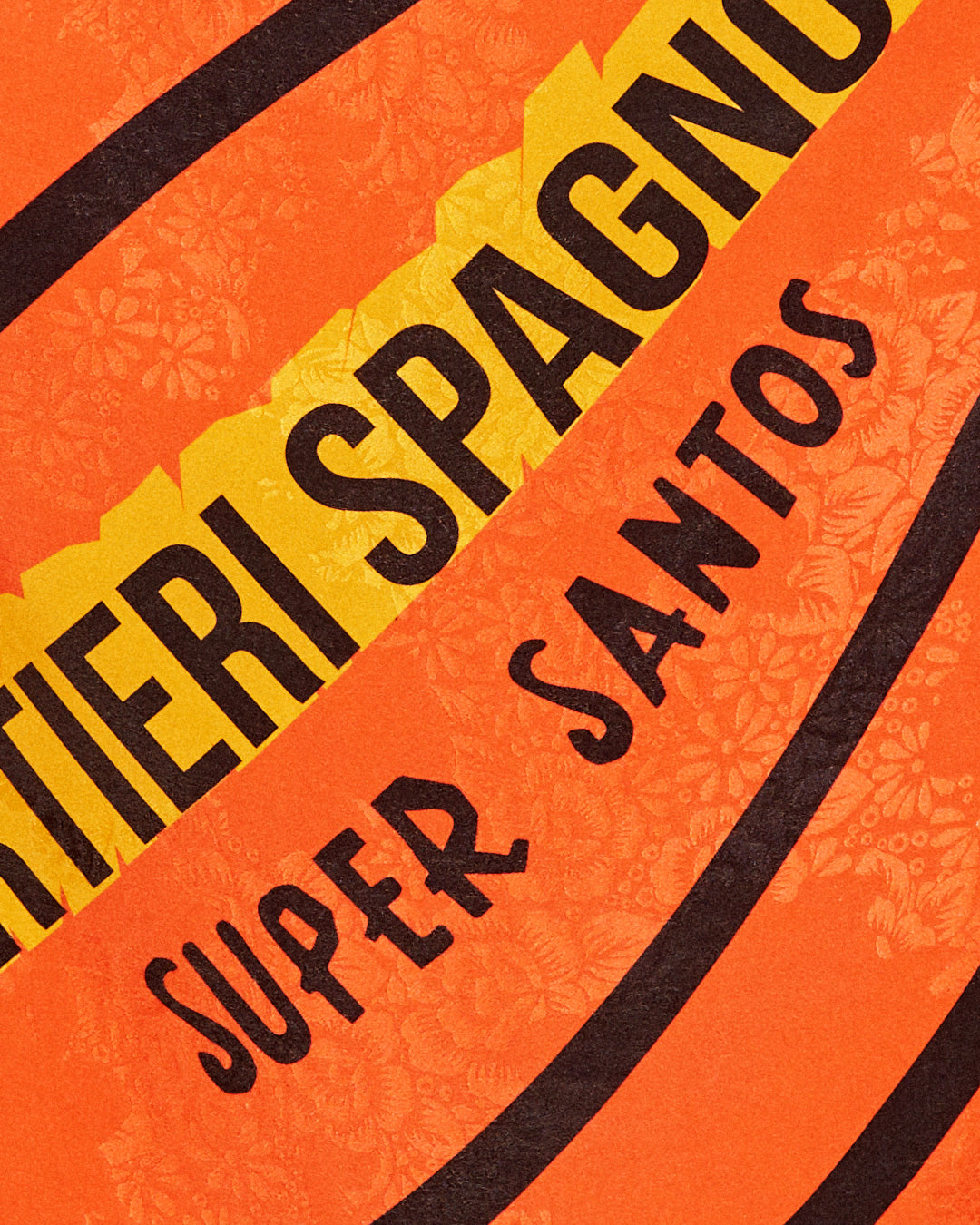 Bandana in seta con lavorazione jacquard stampa all over con fondo arancione e logo “QUARTIERI SPAGNOLI Super Santo” con simboli nero e giallo oro.