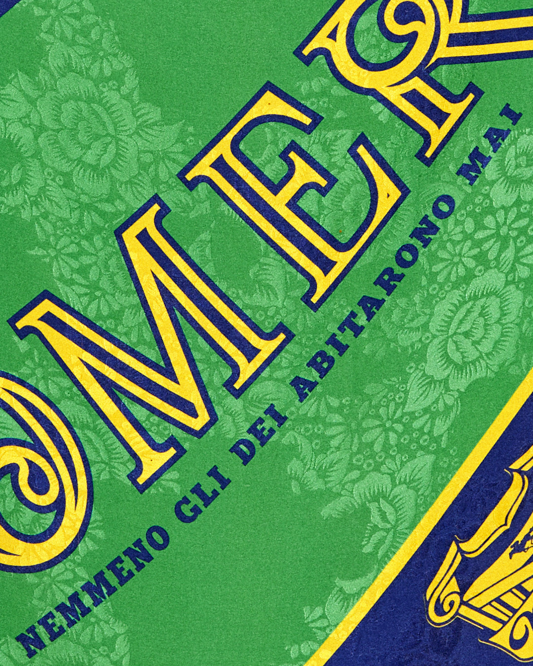 Bandana in seta con lavorazione jacquard stampa all over con fondo verde Vomero e logo “VOMERO nemmeno gli dei abitarono mai” con simboli e claim blu e giallo oro.