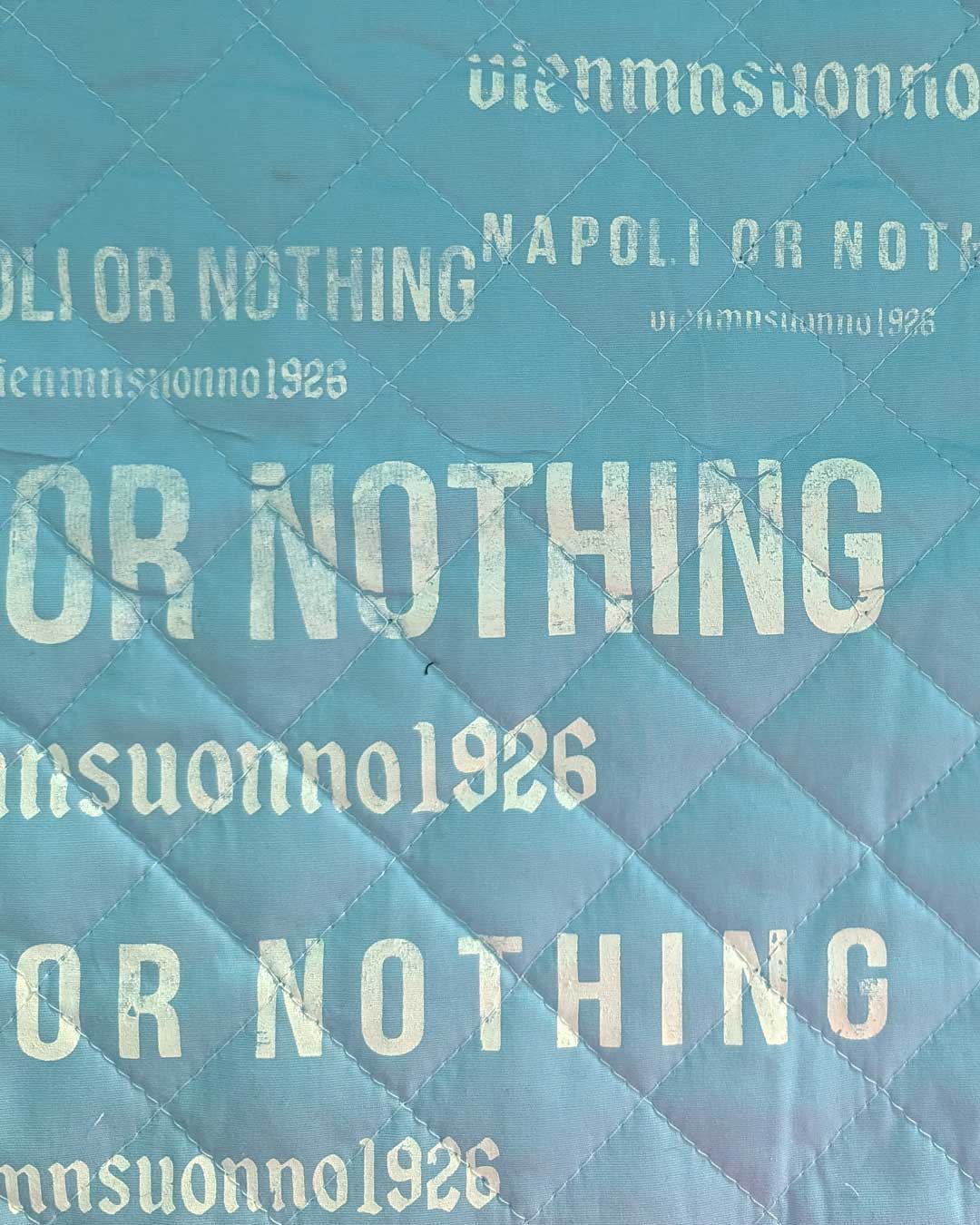 Costina nera 8 cm al fondo e ai polsi, colletto in costina, tasche a filetto. Chiusura con cerniera lampo. Imbottitura 120 gr in cotone azzurro trapuntato con stampa serigrafica all over in off white "NAPOLI OR NOTHING".
