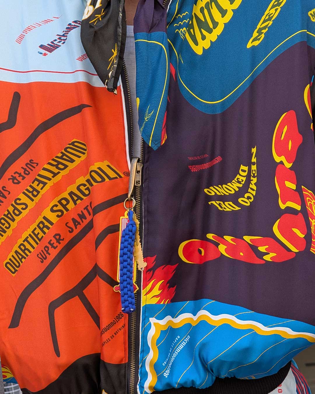 Ciro indossa bomber in twill di seta con stampa all over ripreso dalle grafiche delle bandane quartieri con effetto distorto.