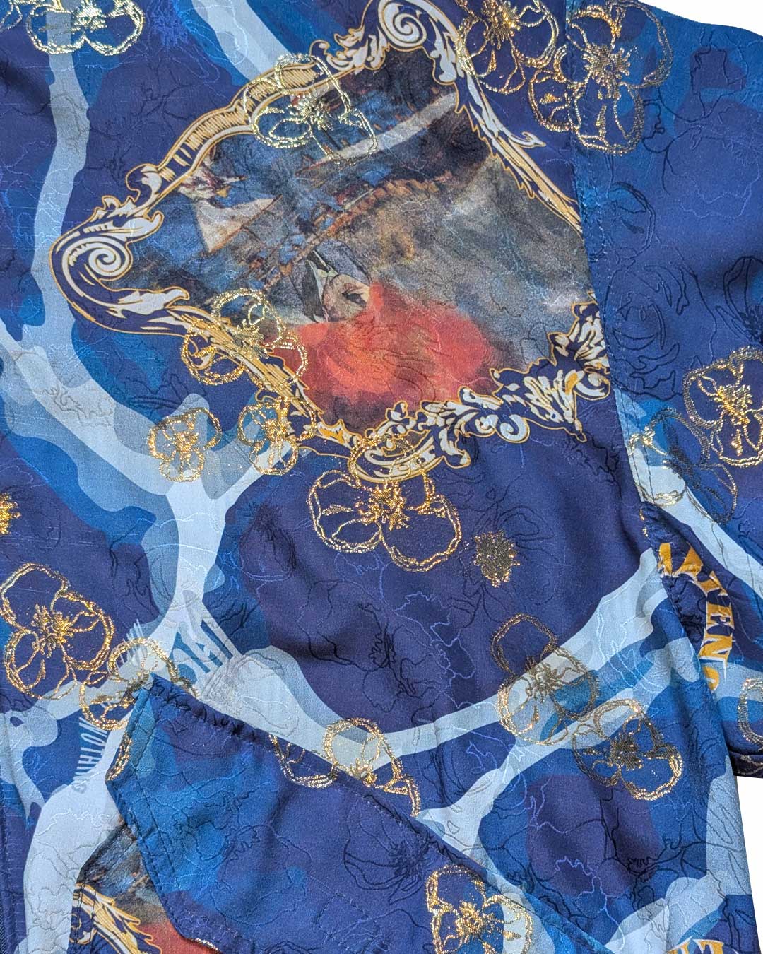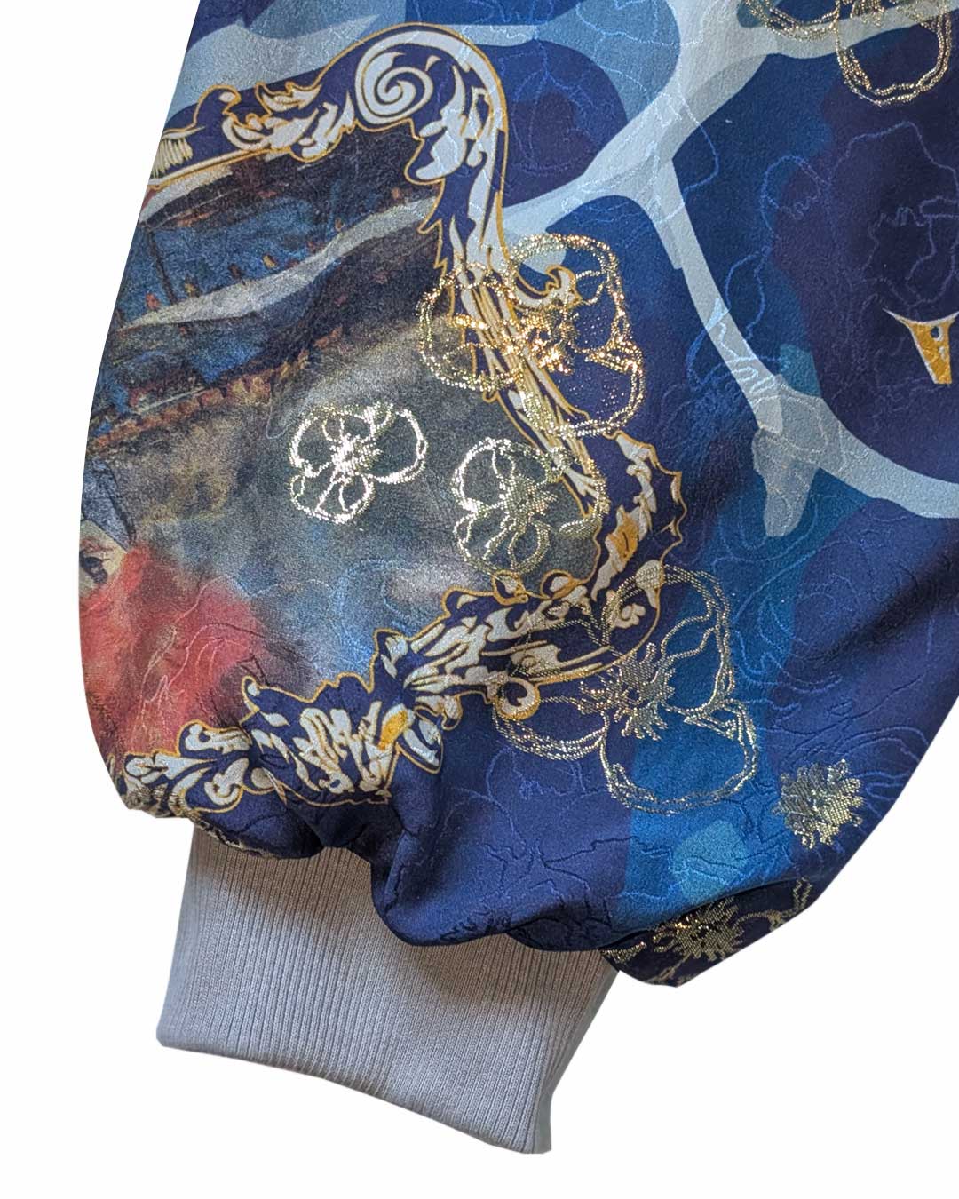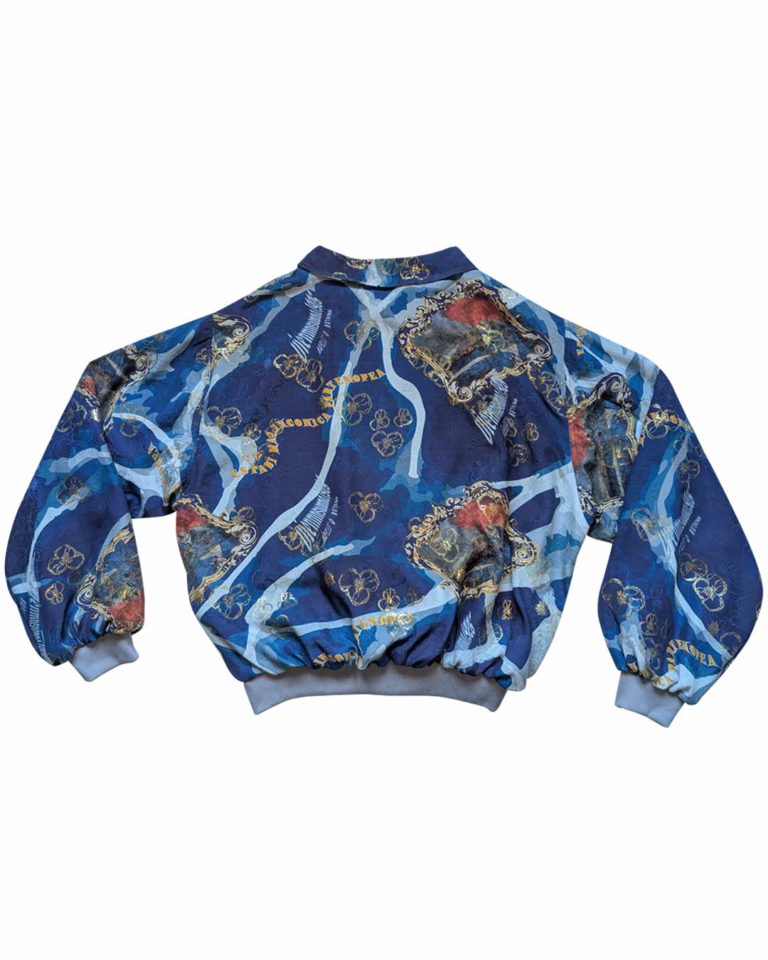 Bomber in di seta jacquard con motivo floreale e fiori in filo lurex oro con stampa all over di pattern con vari motivi tra cui il Vesuvio e Sergio Bruni.