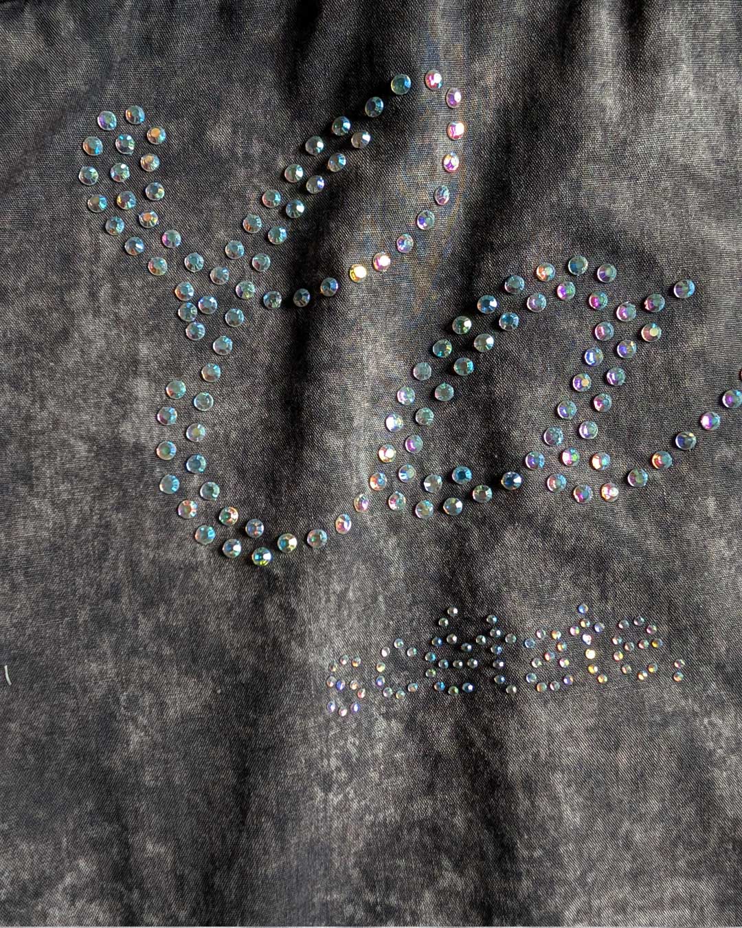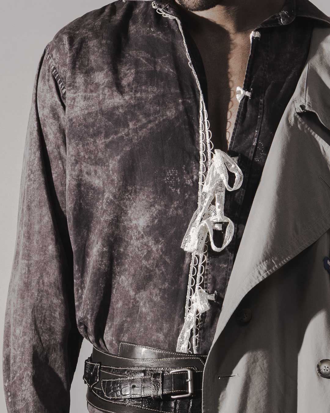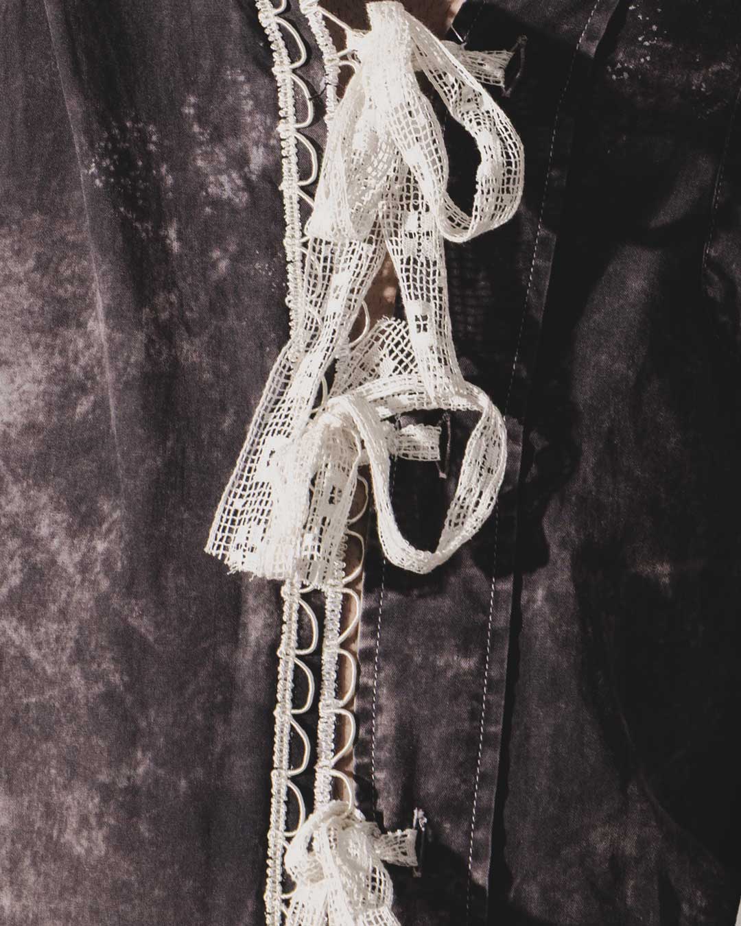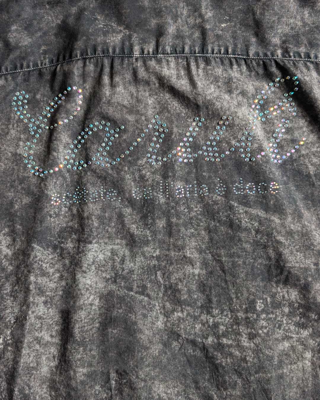 Camicia in cotone con lavaggio nero marmorizzato, applicazione sul retro di strass iridiscenti con scritta "Carulì, scetate ca l'aria è doce". Arricchita con passamaneria avorio sul davanti e sul fondo e laccettini in pizzo che permettono di chiuderla in modo asimmetrico. Bottoni in madreperla.