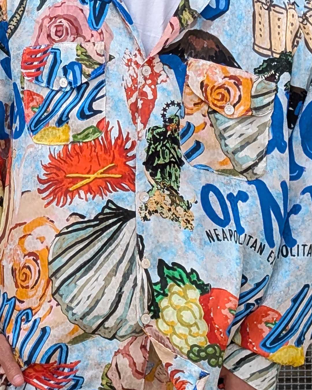 Raffaele indossa camicia modello worker in seta jacquard con stampa all over multicolor.