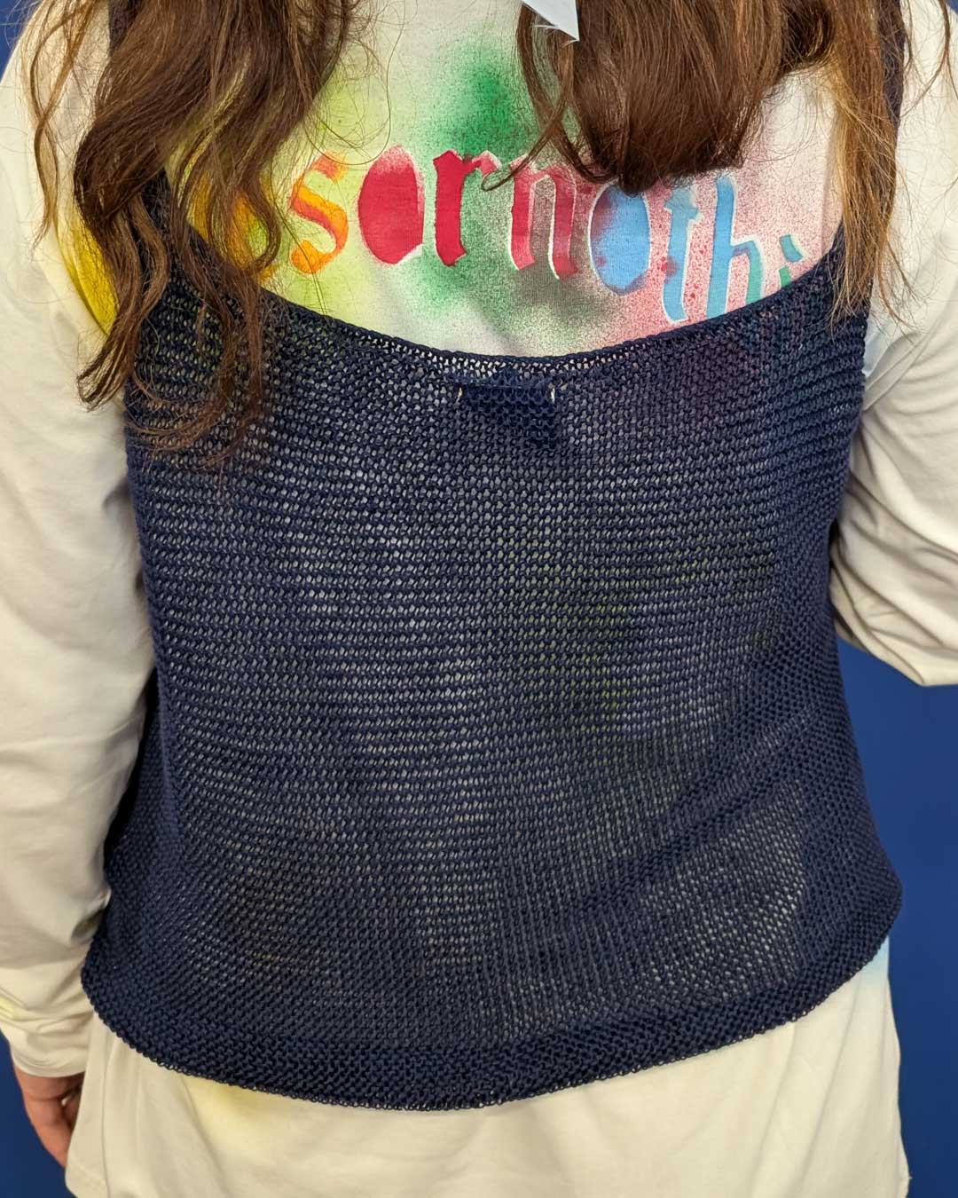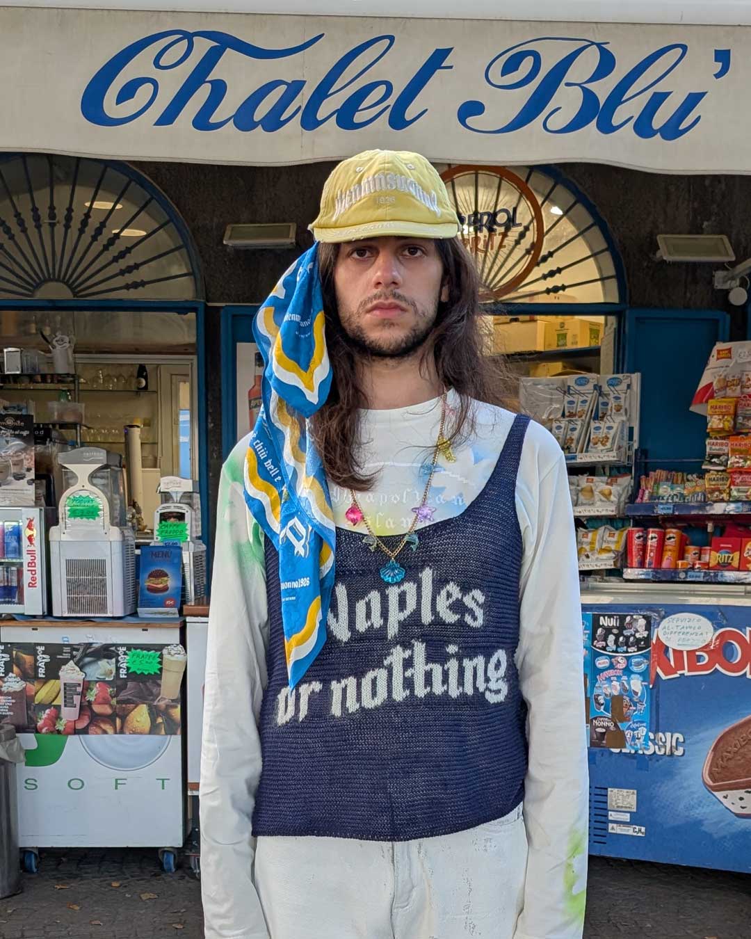 Enrico indossa canotta in mesh filato lino blu navy con scritta "NAPLES OR NOTHING" off-white in filato astro mohair.