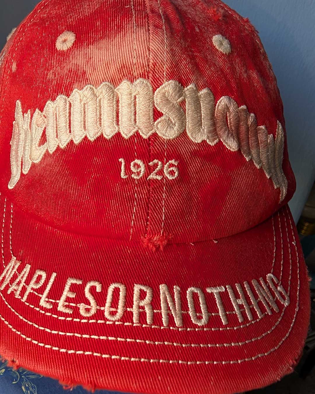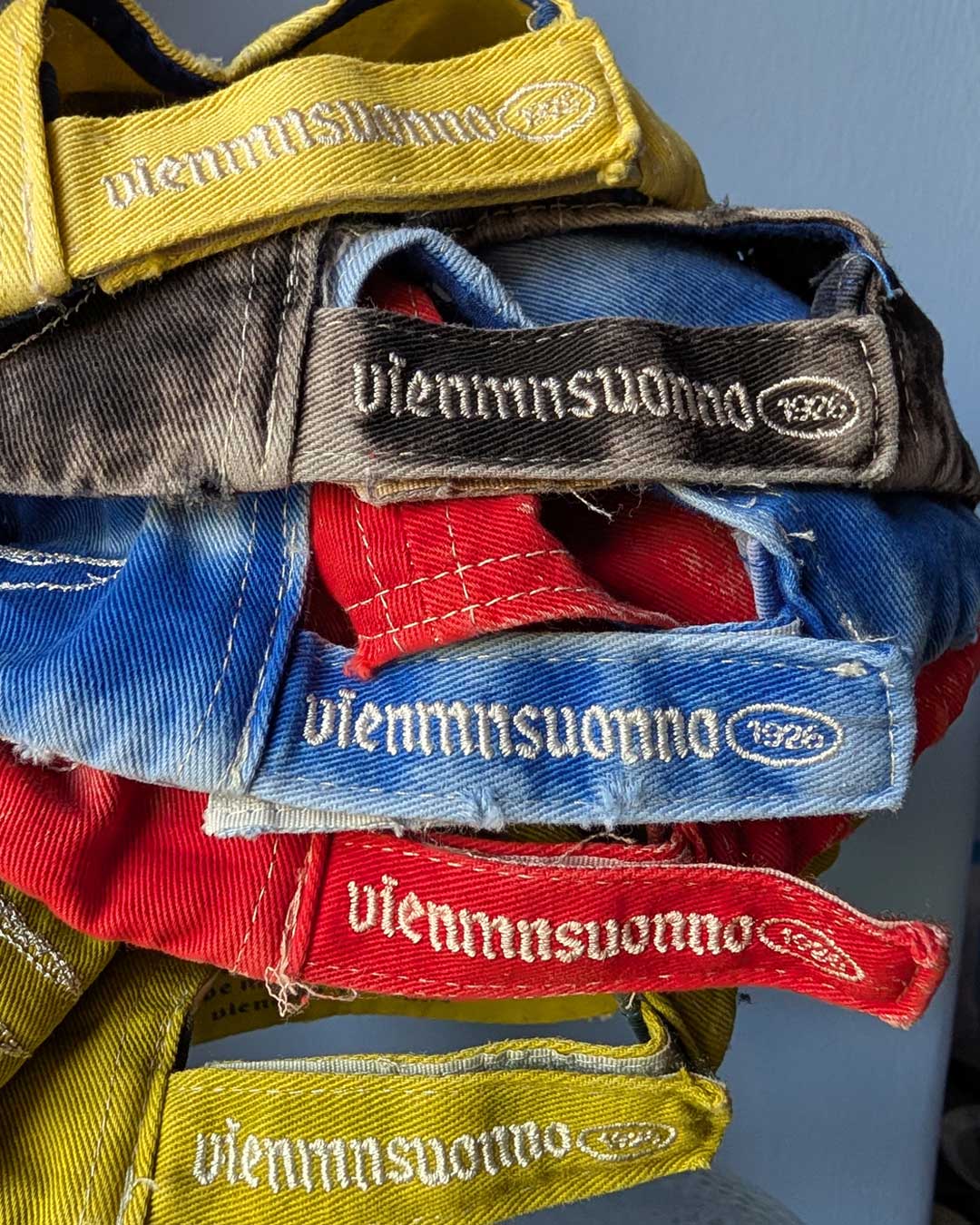 Cappellino in cotone con lavaggio effetto vintage o marmorizzato a seconda del colore, ricami bianchi e in tono sul retro, regolabile mediante velcro. Stampa interna sulla visiera e bollino adesivo dorato. Ogni capo sarà diverso dall'altro.