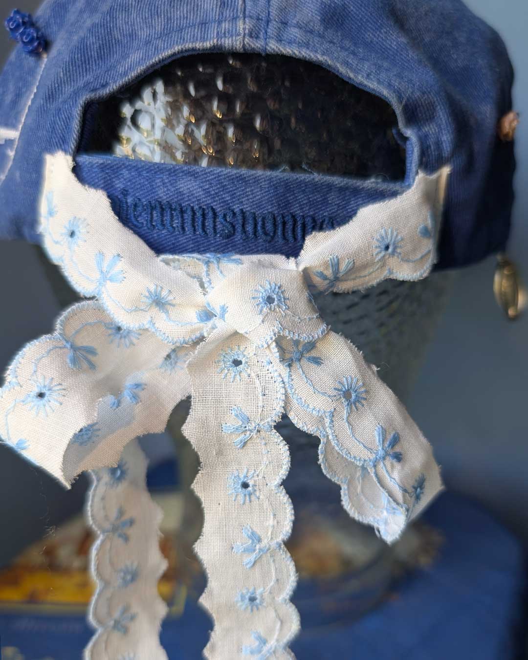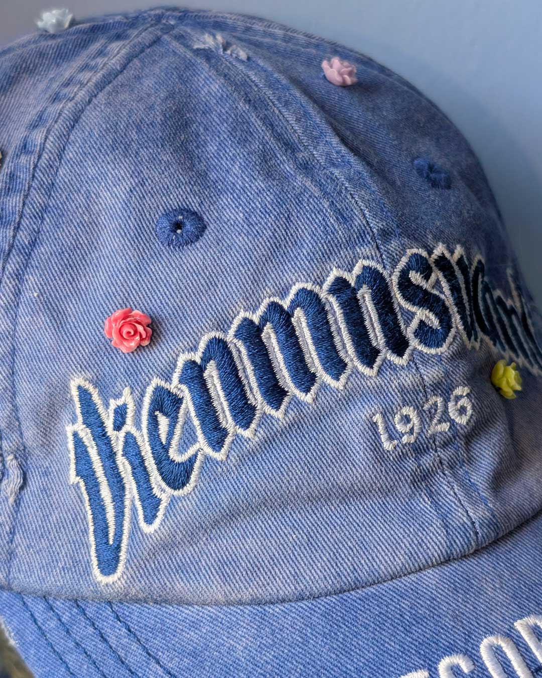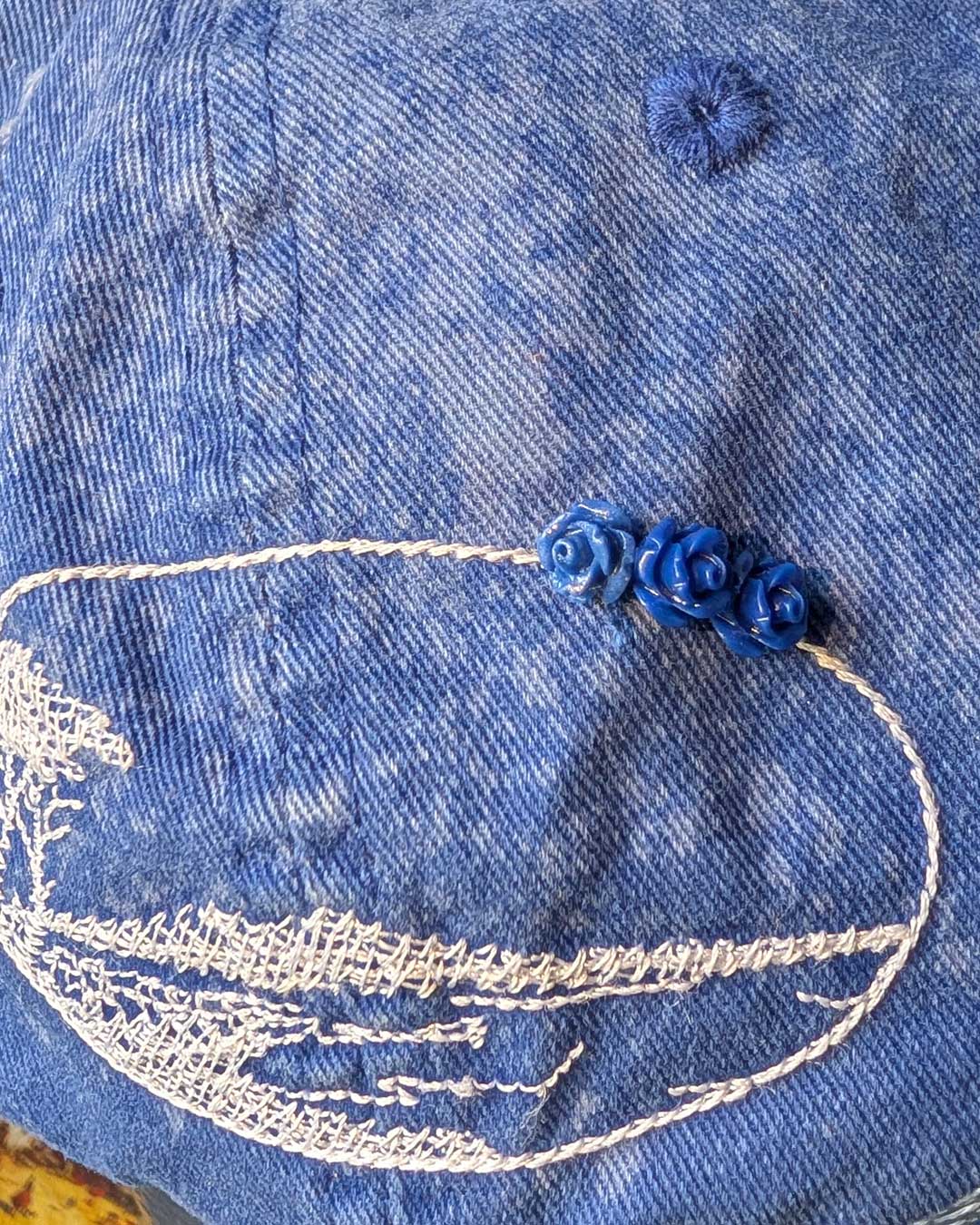 Cappellino in cotone super blu con lavaggio effetto vintage garment dyed, ricami bianchi e in tono sul retro, regolabile mediante velcro.