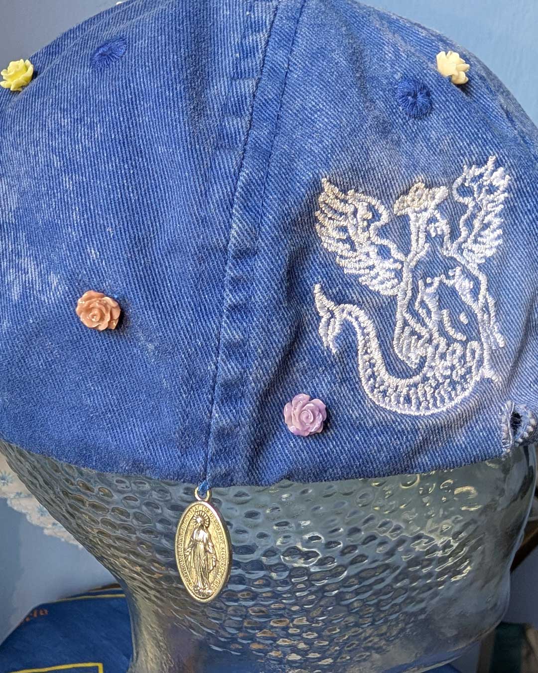 Applicazione di roselline colorate in resina, medaglietta raffigurante la Madonna e nastrino in sangallo sul retro.
