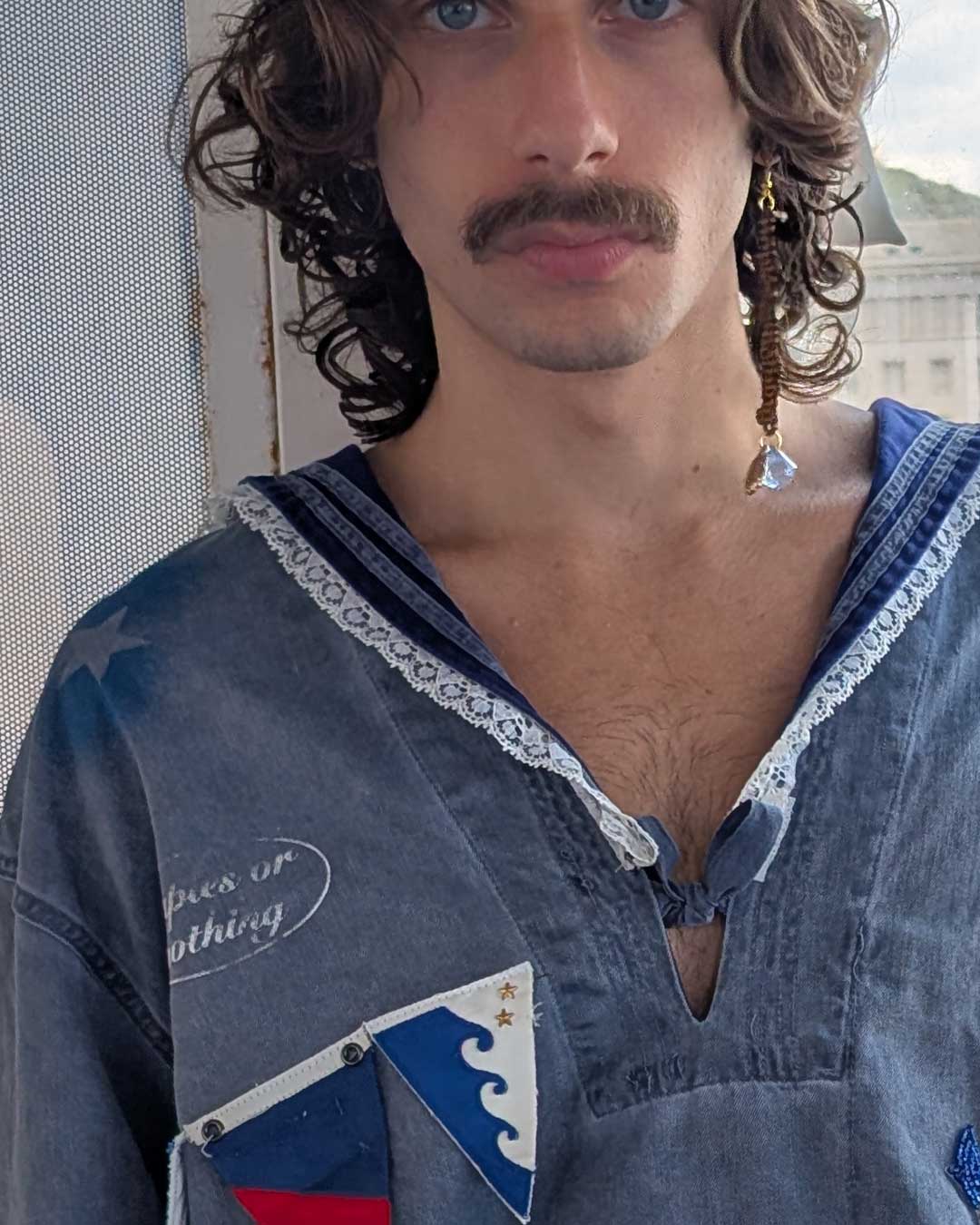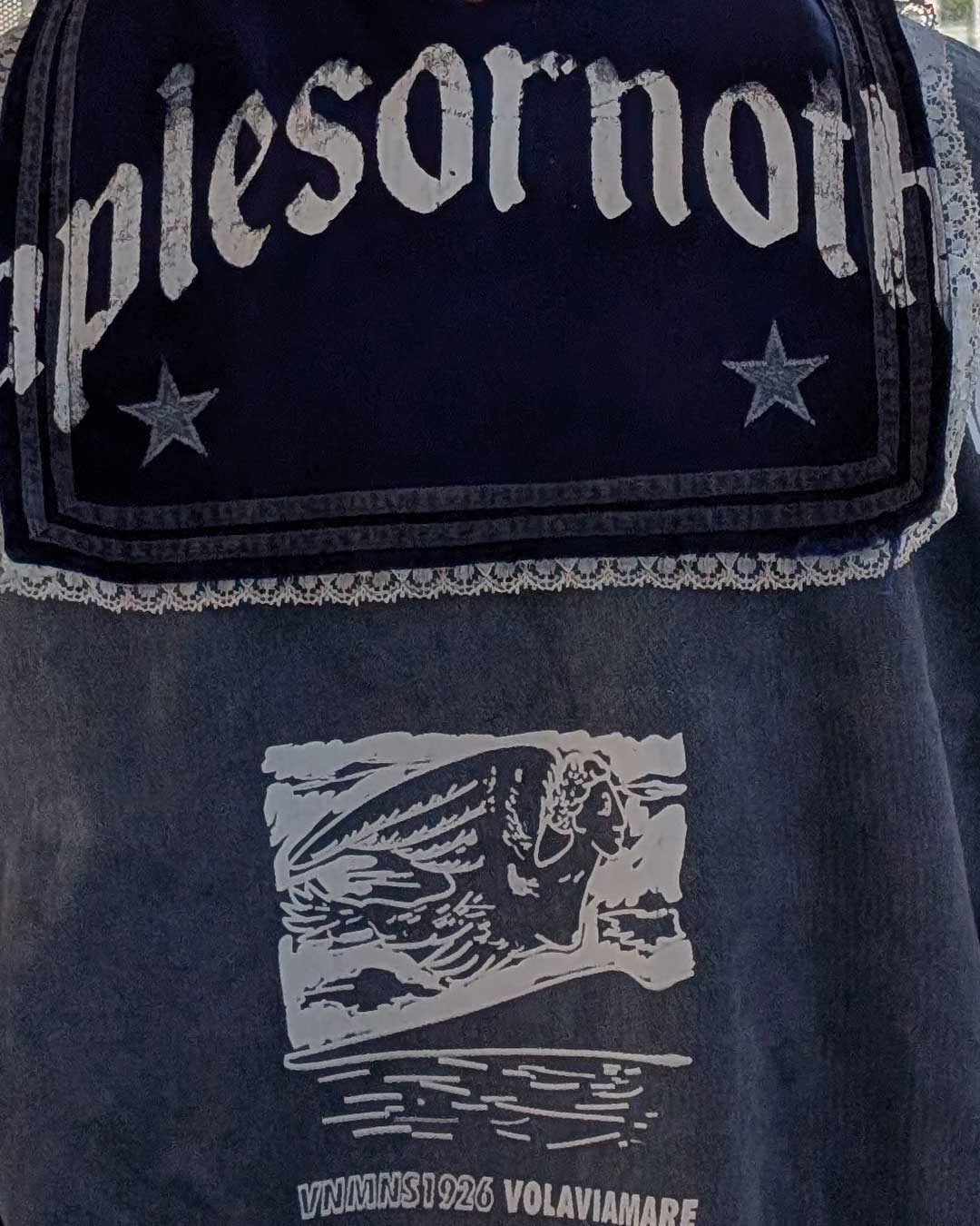 Dominique indossa casacca vintage divisa da marinaio rivisitata con lavaggio dyed grigio, stampe serigrafiche off white sul fronte e sul retro, applicazione di patch e passamanerie, stampa effetto spray di stelle in tono