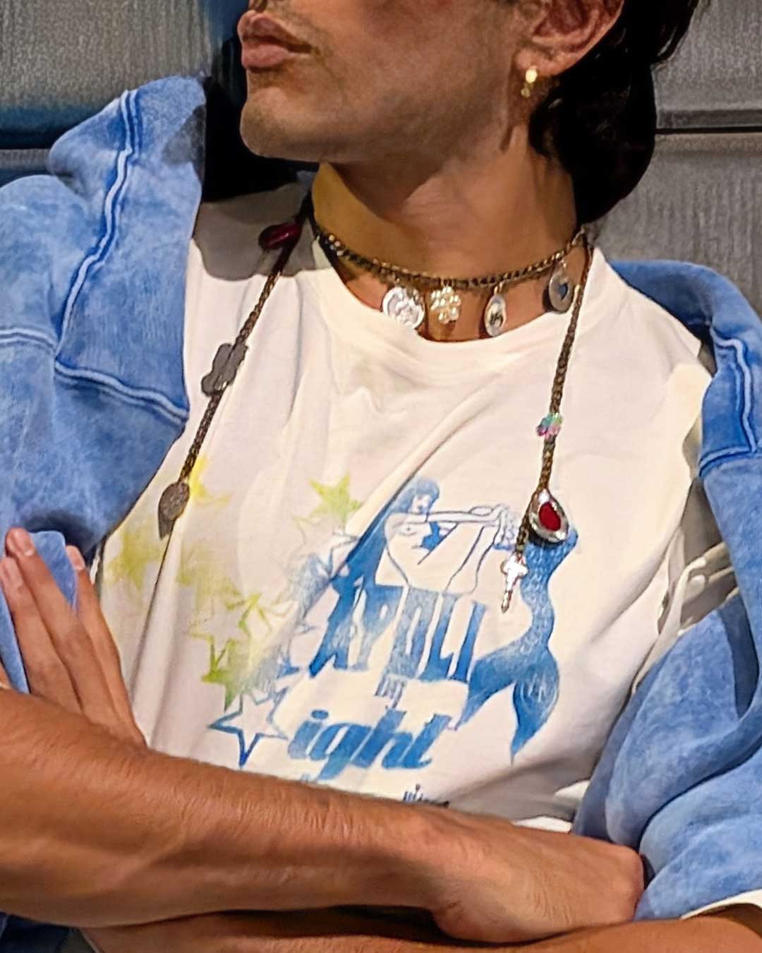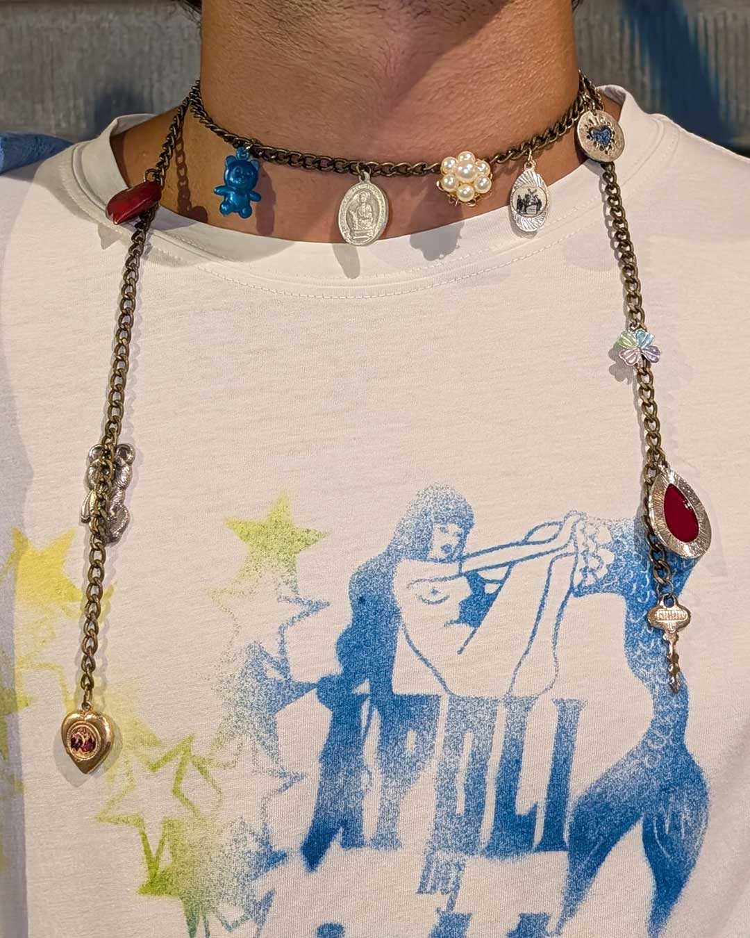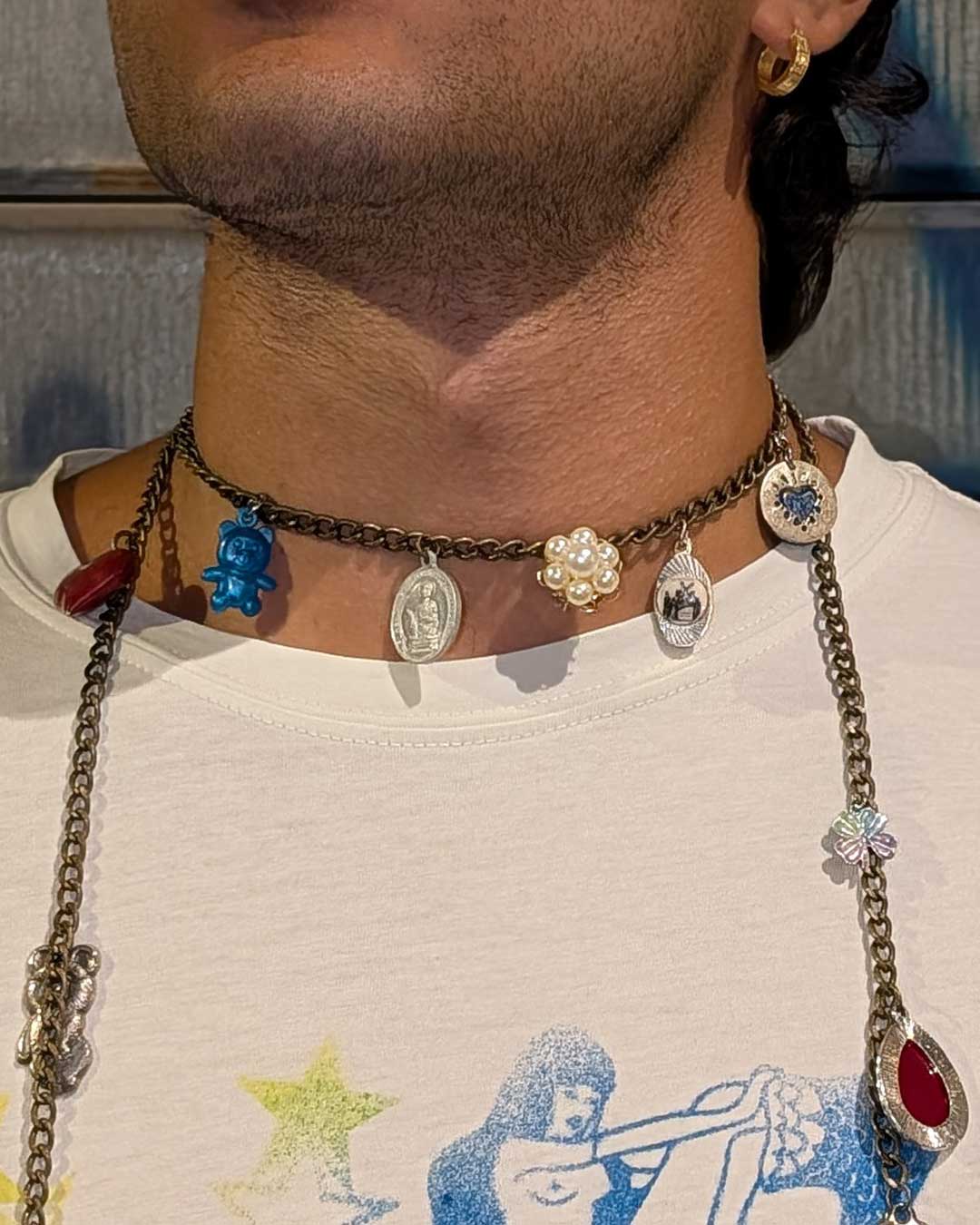 Collanina realizzata a mano con catena a maglie larghecolor bronzo che si chiude sul retro con chiusura a calamita modello chocker a cui pensono due catene con ciondoli con differente provenienza.