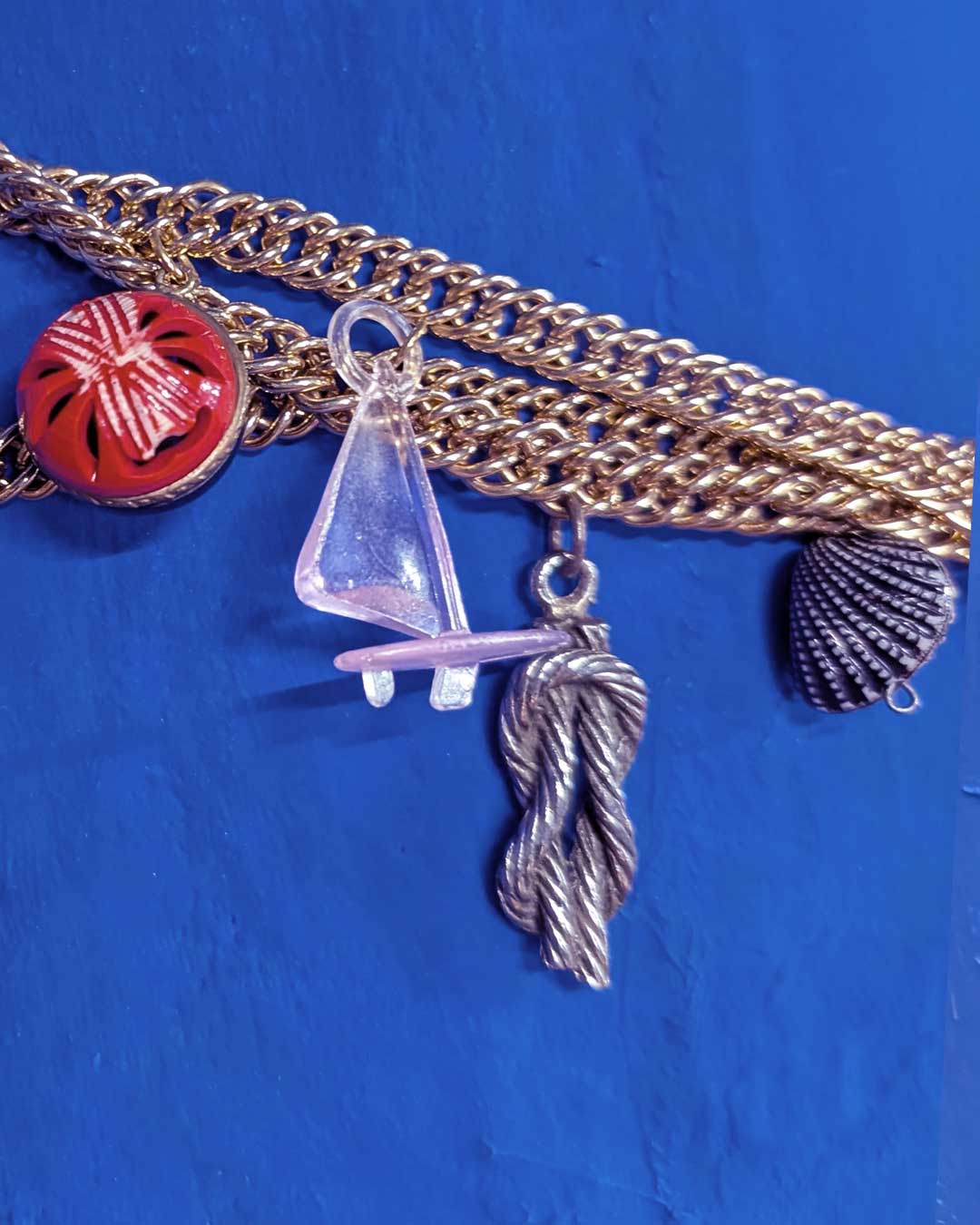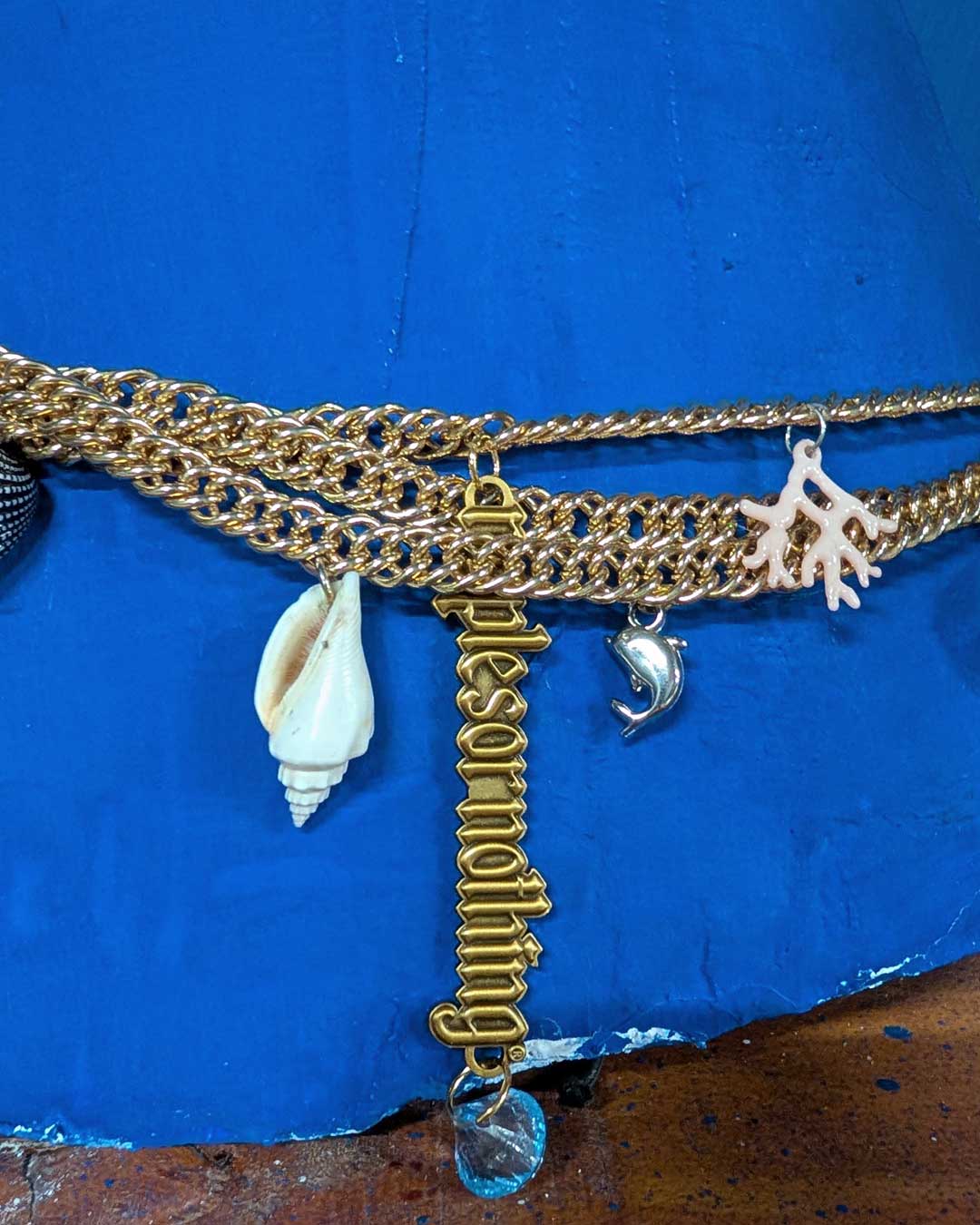 Roxanne indossa cintura in metallo dorato con charm in plastica e metallo a tema marino.