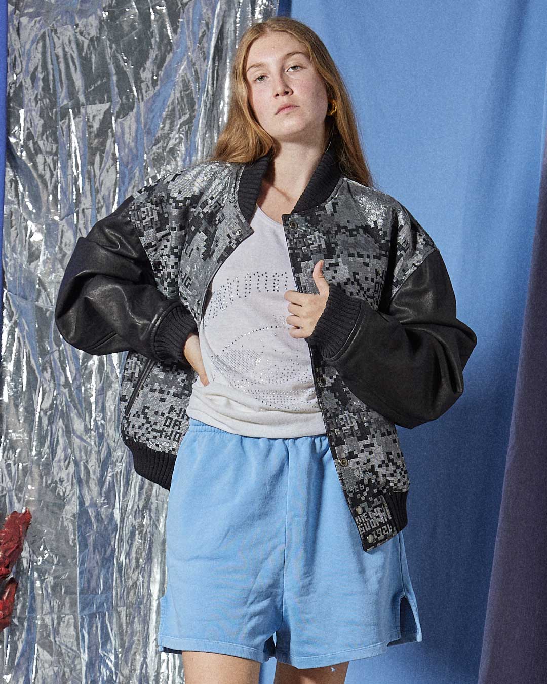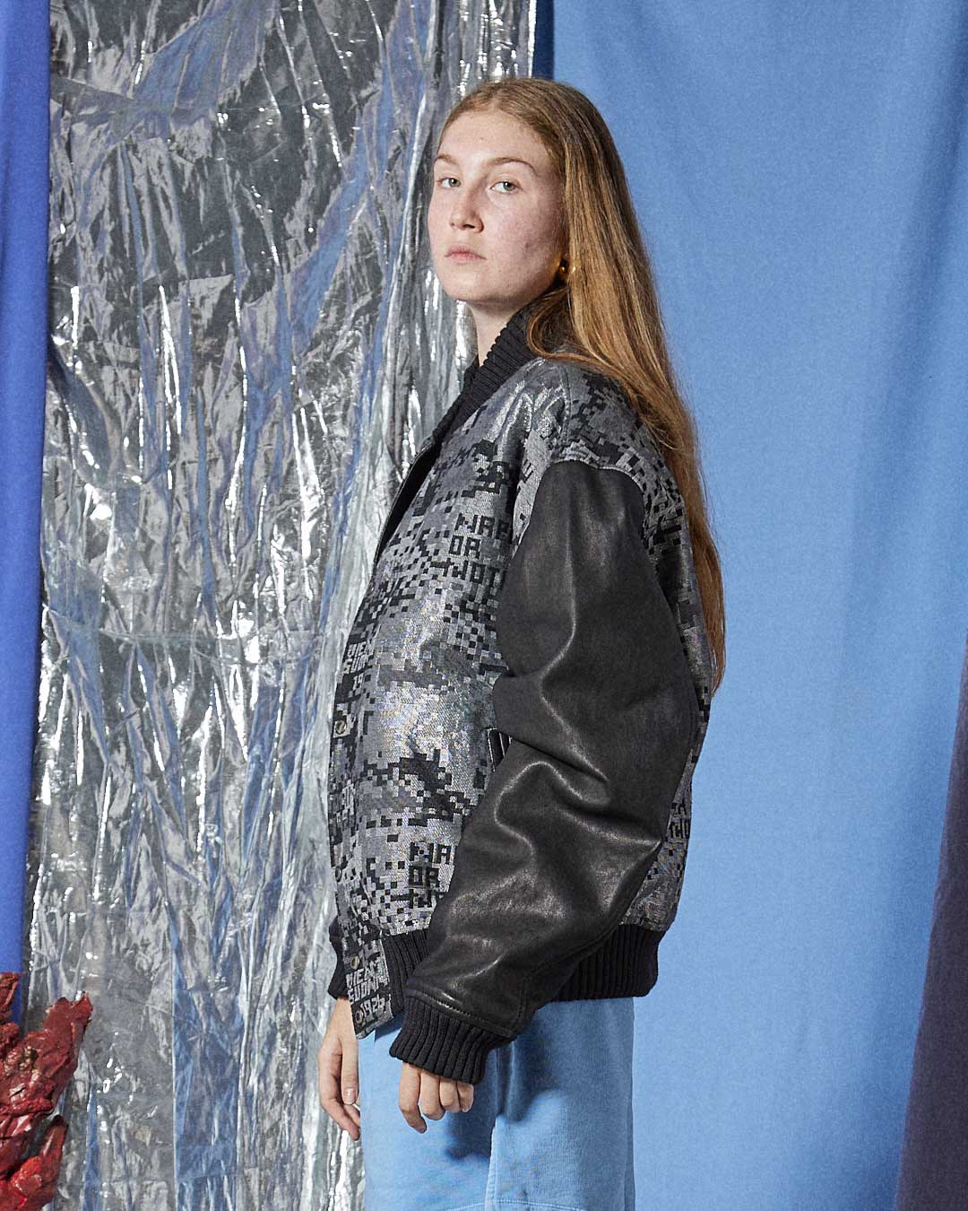 College in pelle nera con polsini e bordo inferiore in maglia, inserti in tessuto jacquard nei toni del nero e grigio.