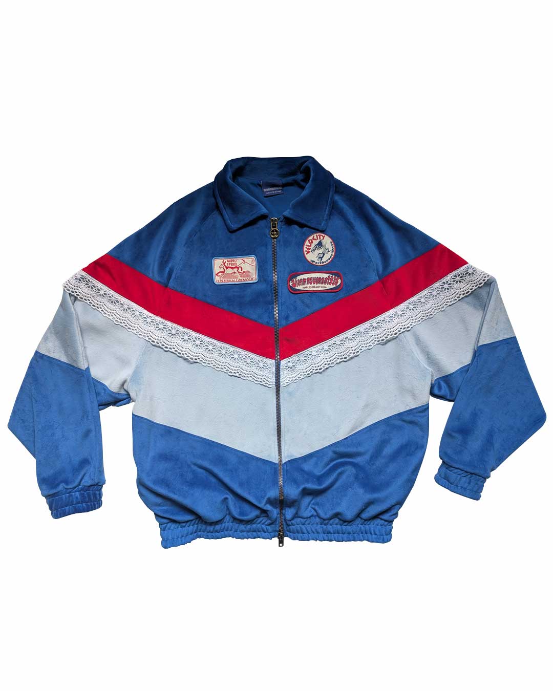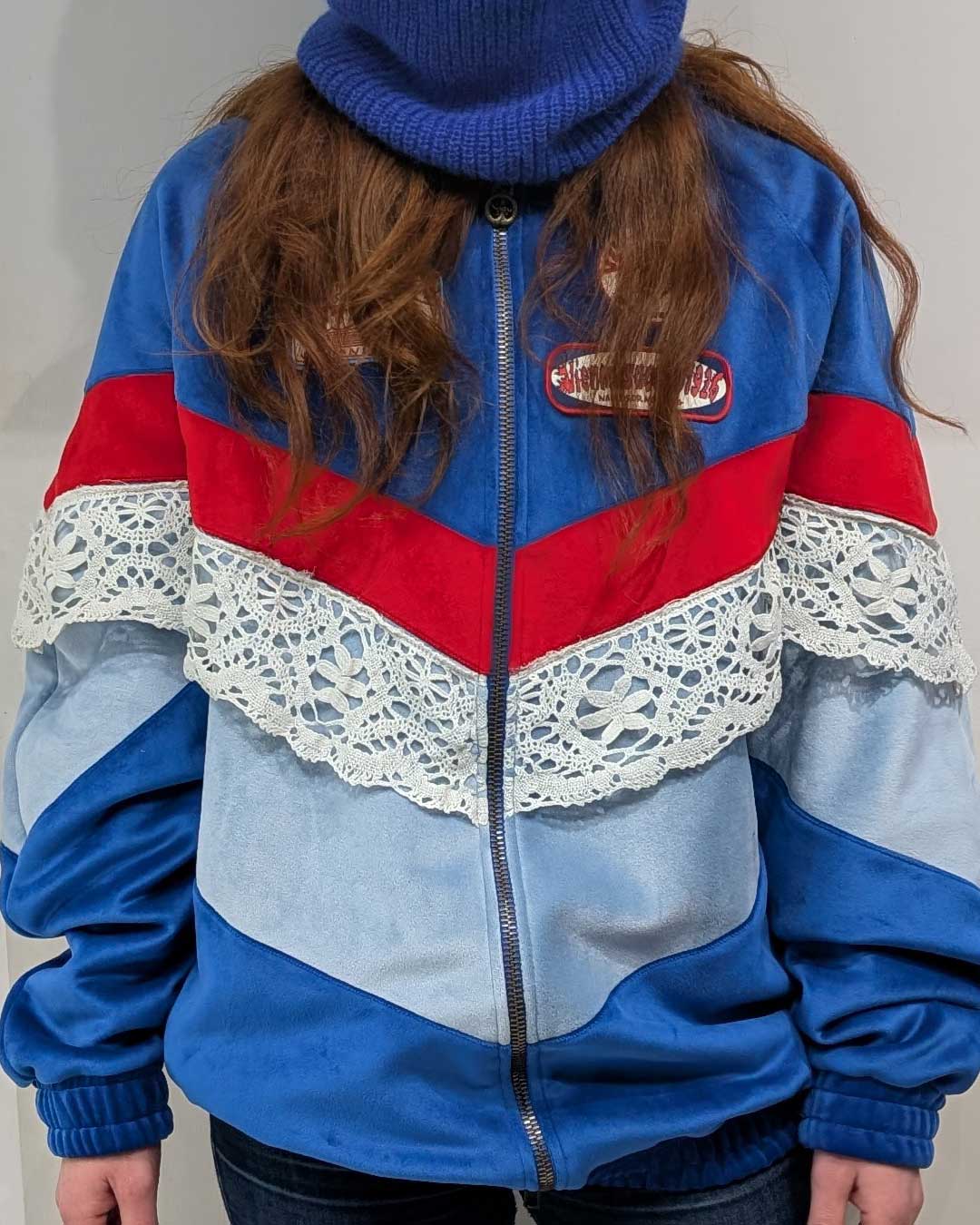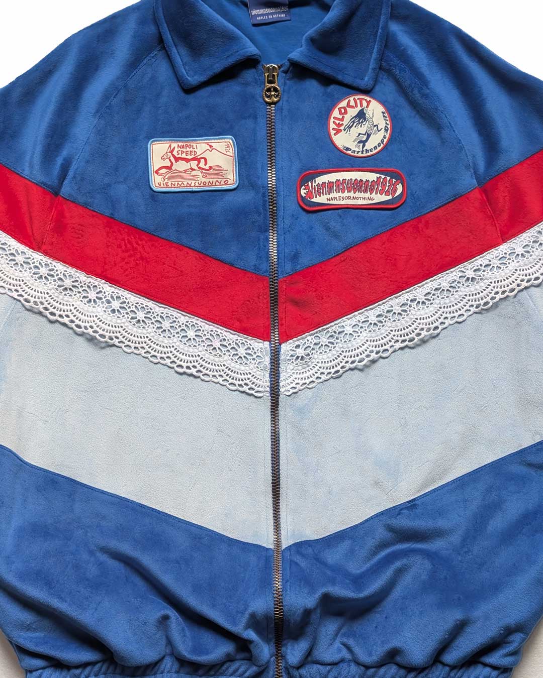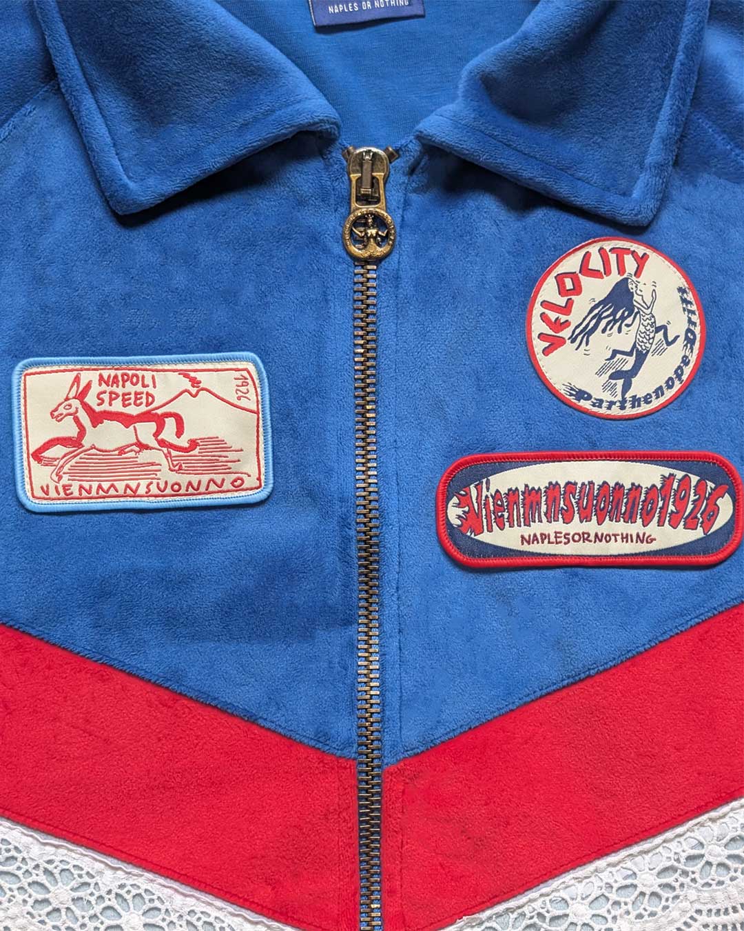 Felpa tracksuit blu fit baloon con tasche laterali, manica raglan, colletto, cerniera ottone antico catena 8 con doppio cursore, puller con sirena, inserti rosso e celeste, passamaneria vintage in crochet, patch in jacquard sul fronte, ricamo "naplesornothing" in off-white sul retro.