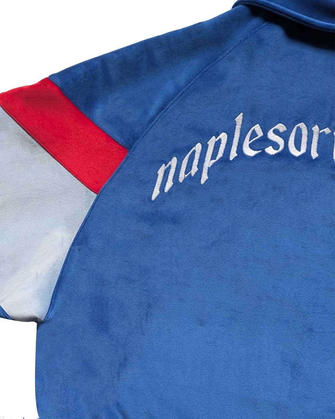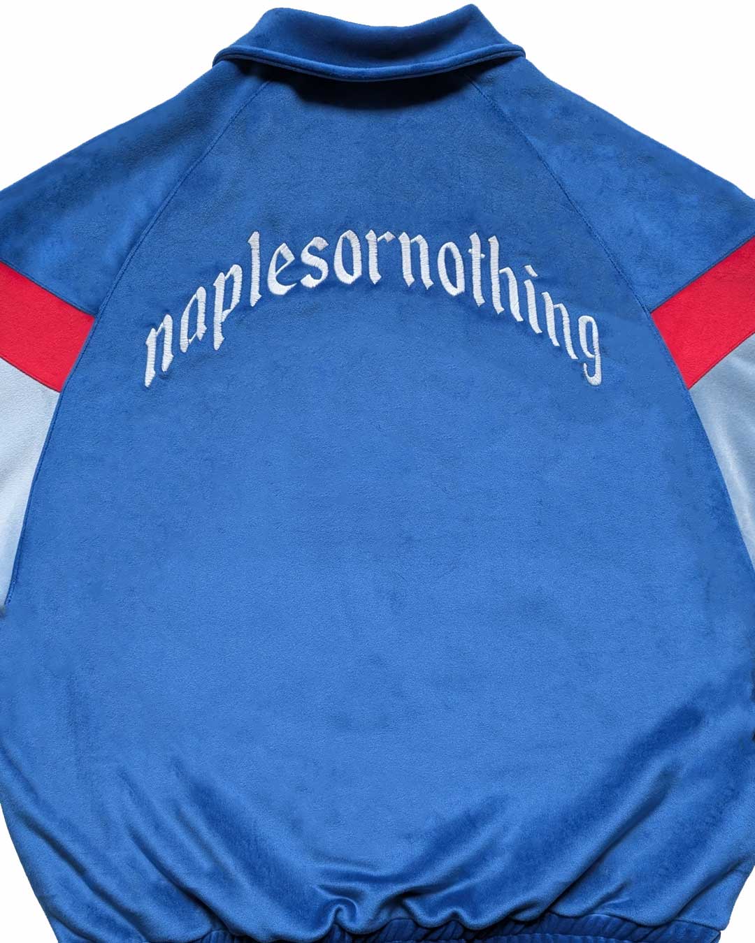 Felpa tracksuit blu fit baloon con tasche laterali, manica raglan, colletto, cerniera ottone antico catena 8 con doppio cursore, puller con sirena, inserti rosso e celeste, passamaneria vintage in crochet, patch in jacquard sul fronte, ricamo "naplesornothing" in off-white sul retro.