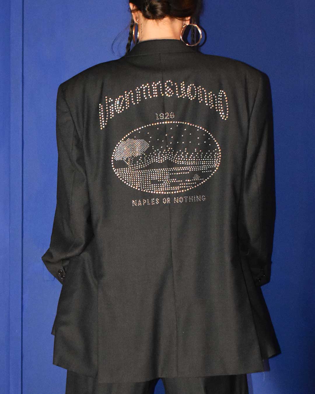 Giacca grigio scuro vintage in lana con stampa sul retro di strass iridiscenti raffigurante paesaggio con vesuvio.