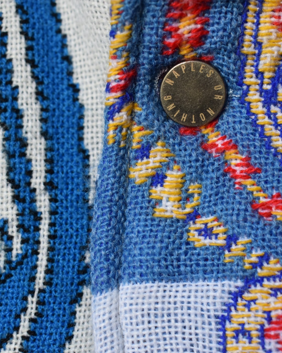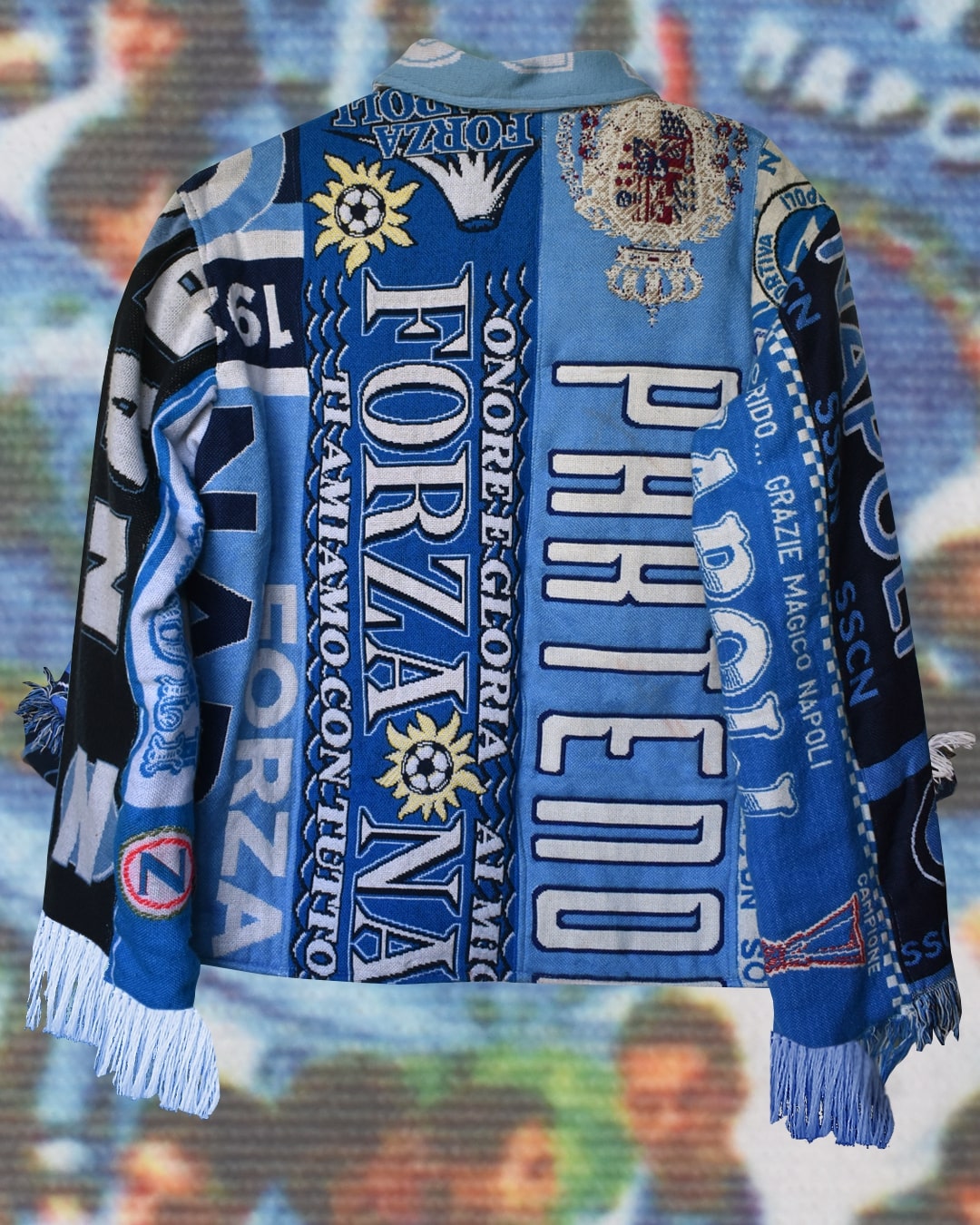 Trilly indossa giacca overshirt sartoriale realizzata con sciarpe vintage del Napoli, ogni capo risulta unico, grazie all'uso di sciarpe e abbinamenti differenti che caratterizzano ogni modello.