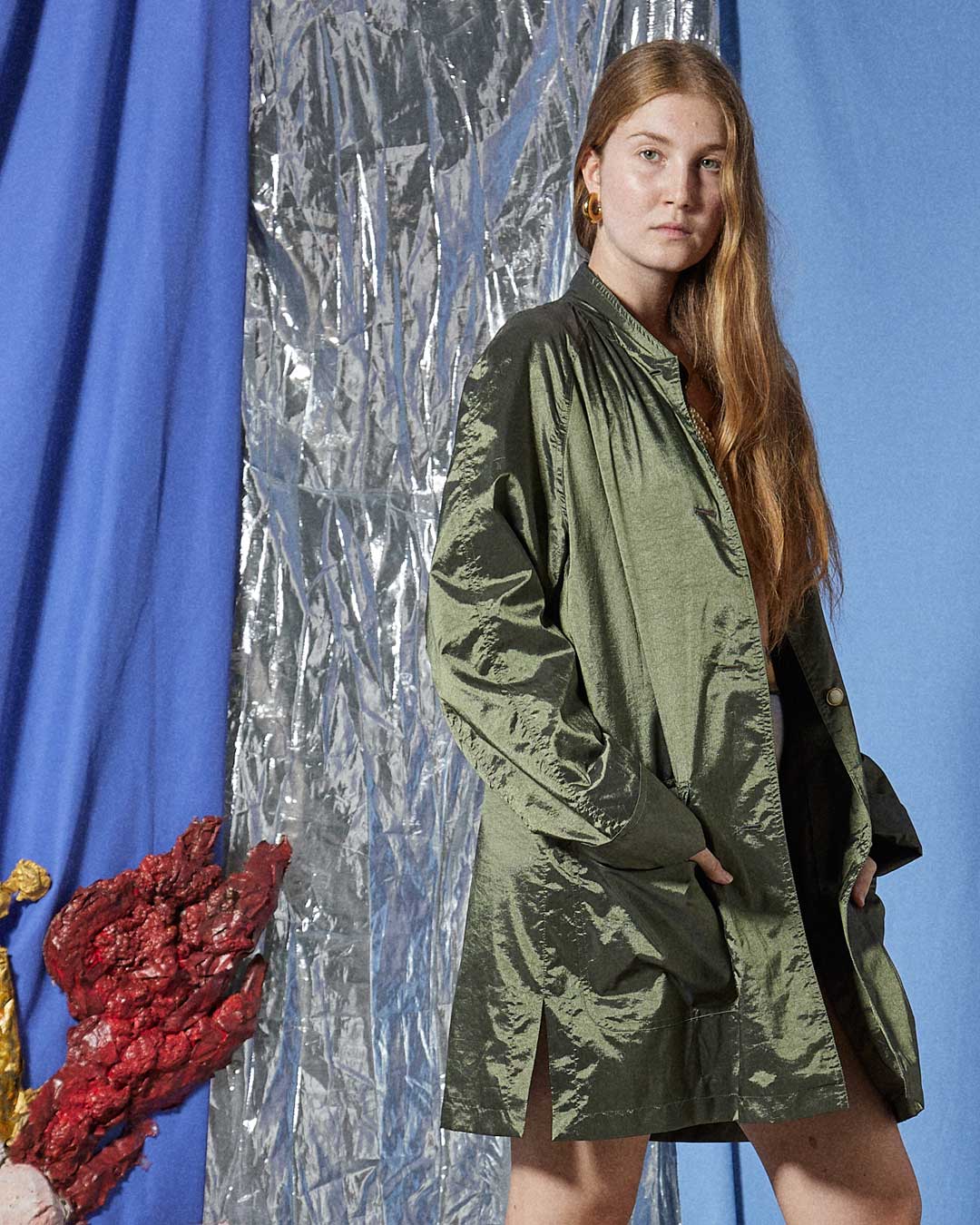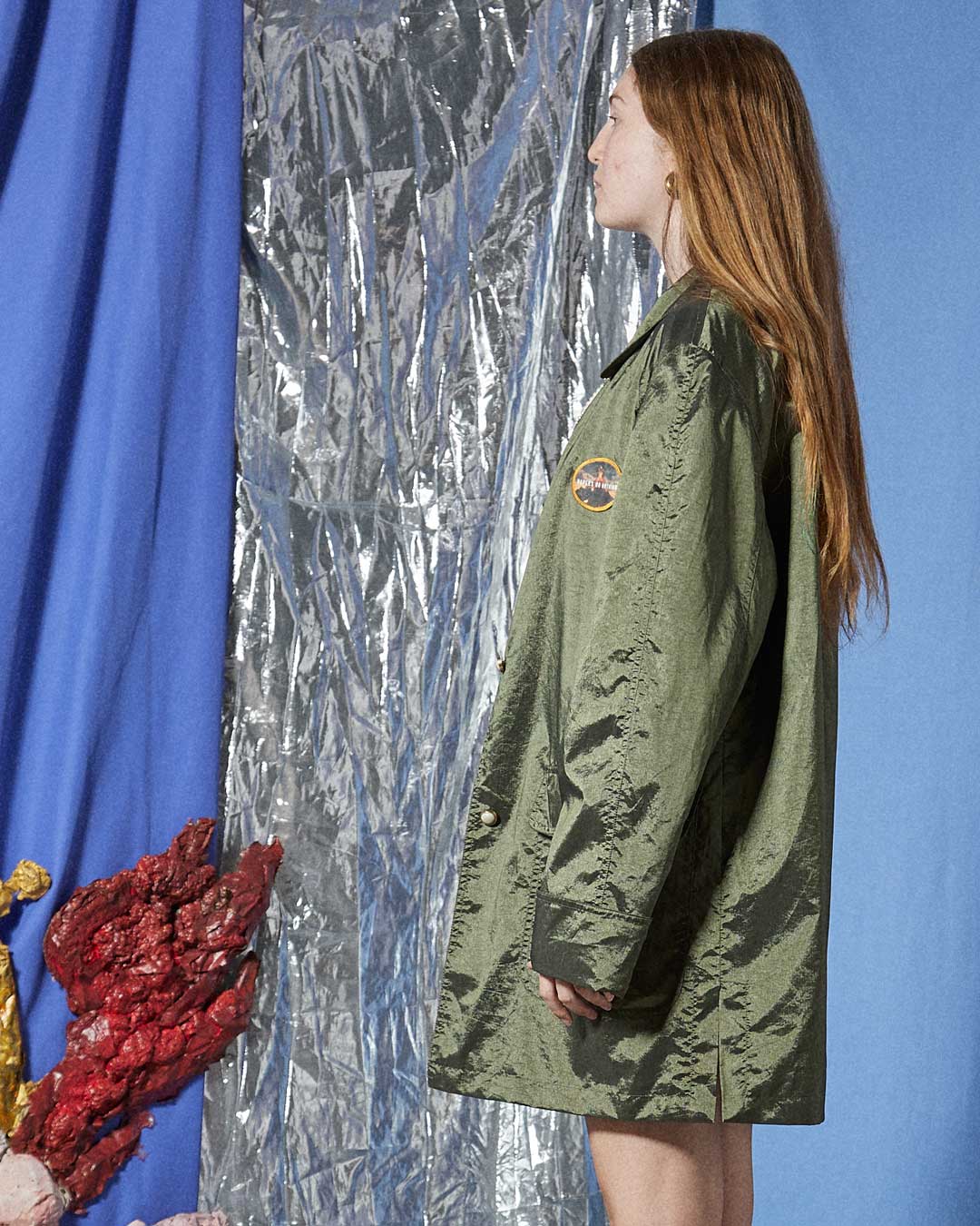 Bottoni verdi e dorati, tasche laterali e colletto.