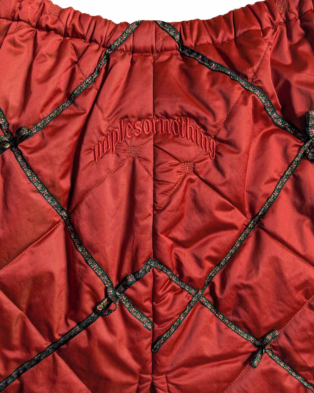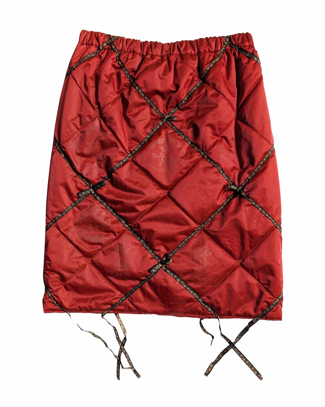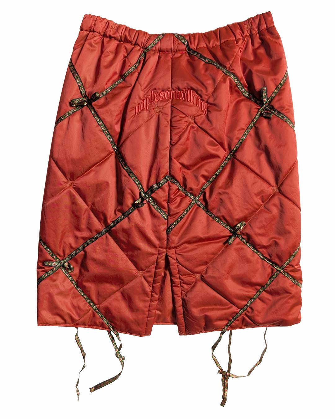 Gonna color ruggine trapuntata a vita alta con elastico in vita, applicazioni di passamaneria a micro fiori che evidenziano i rombi del tessuto trapuntato e creano dei fiocchetti e scendono al fondo. Stampe serigrafiche in tono di cari simboli di Napoli e ricamo in tono sul retro "Napesornothing".
