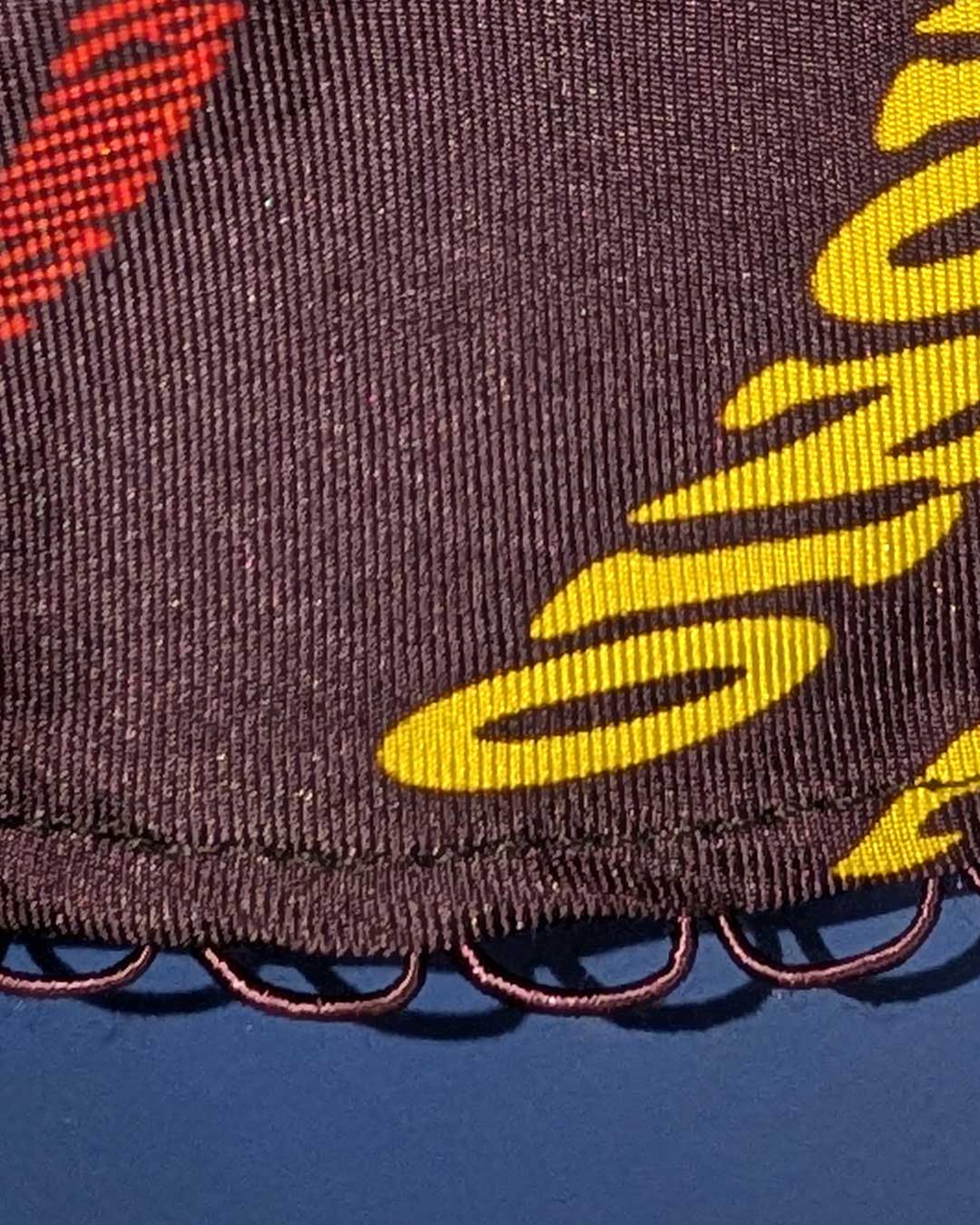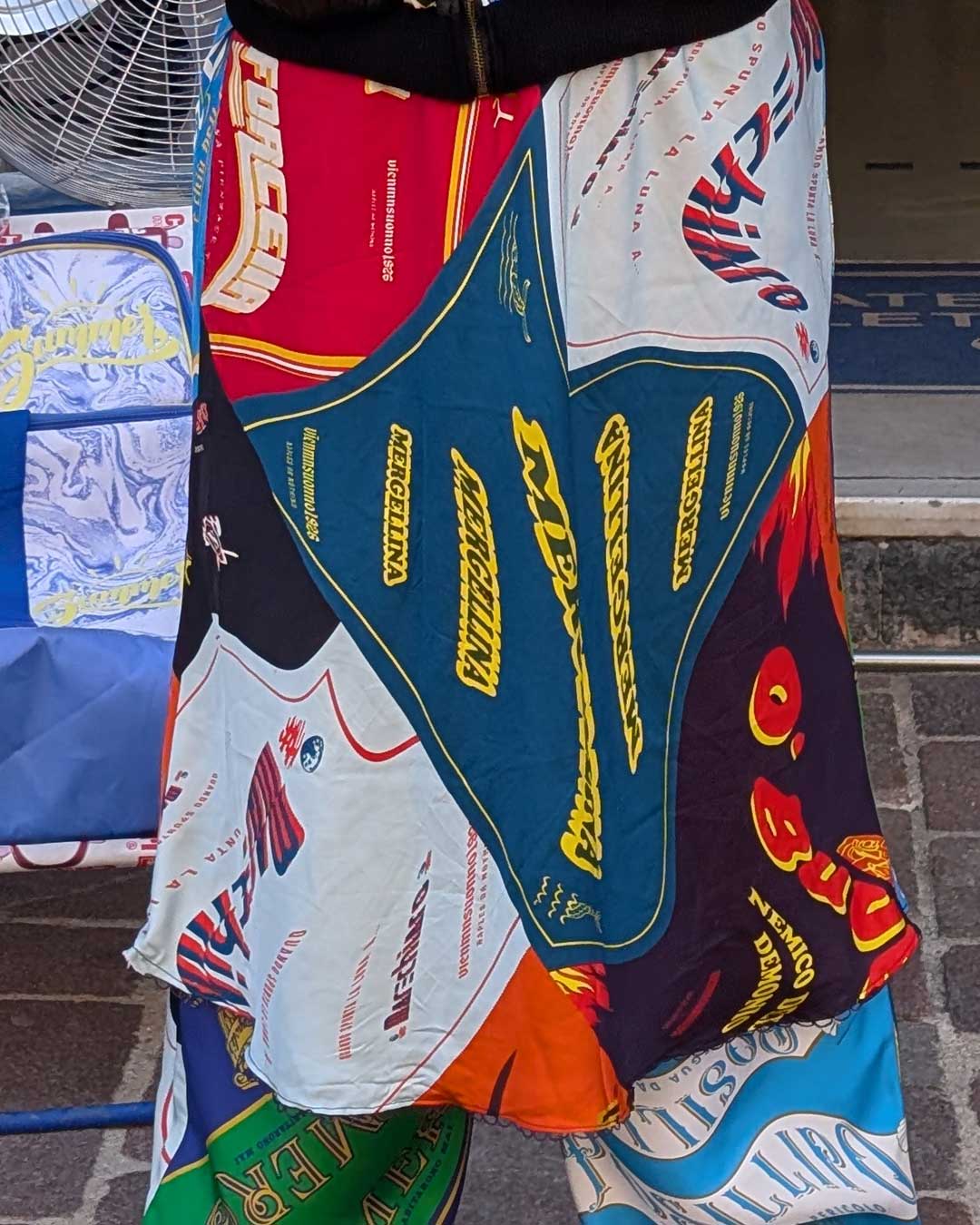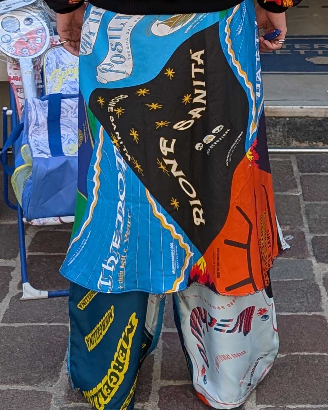 Ciro indossa gonna svasata in twill di seta con stampa all over ripreso dalle grafiche delle bandane quartieri con effetto distorto.