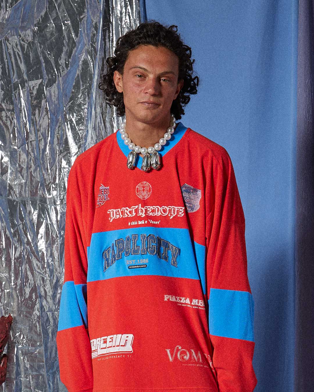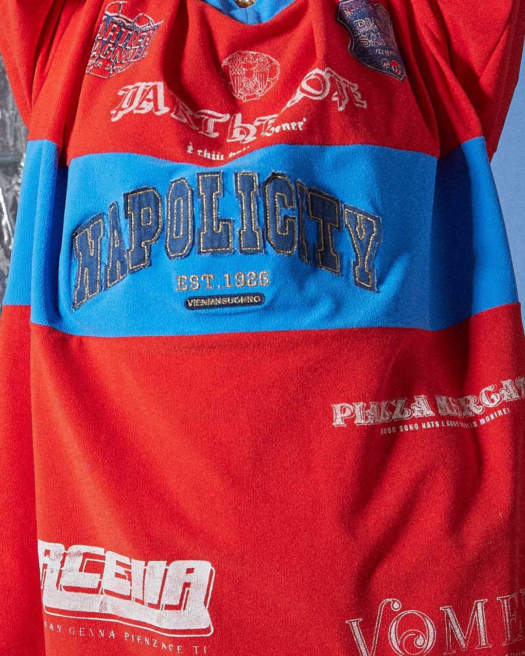 Stampe serigrafiche in bianco sul fronte, manica e retro dei vari quartieri di Napoli con scritte e stemmi.