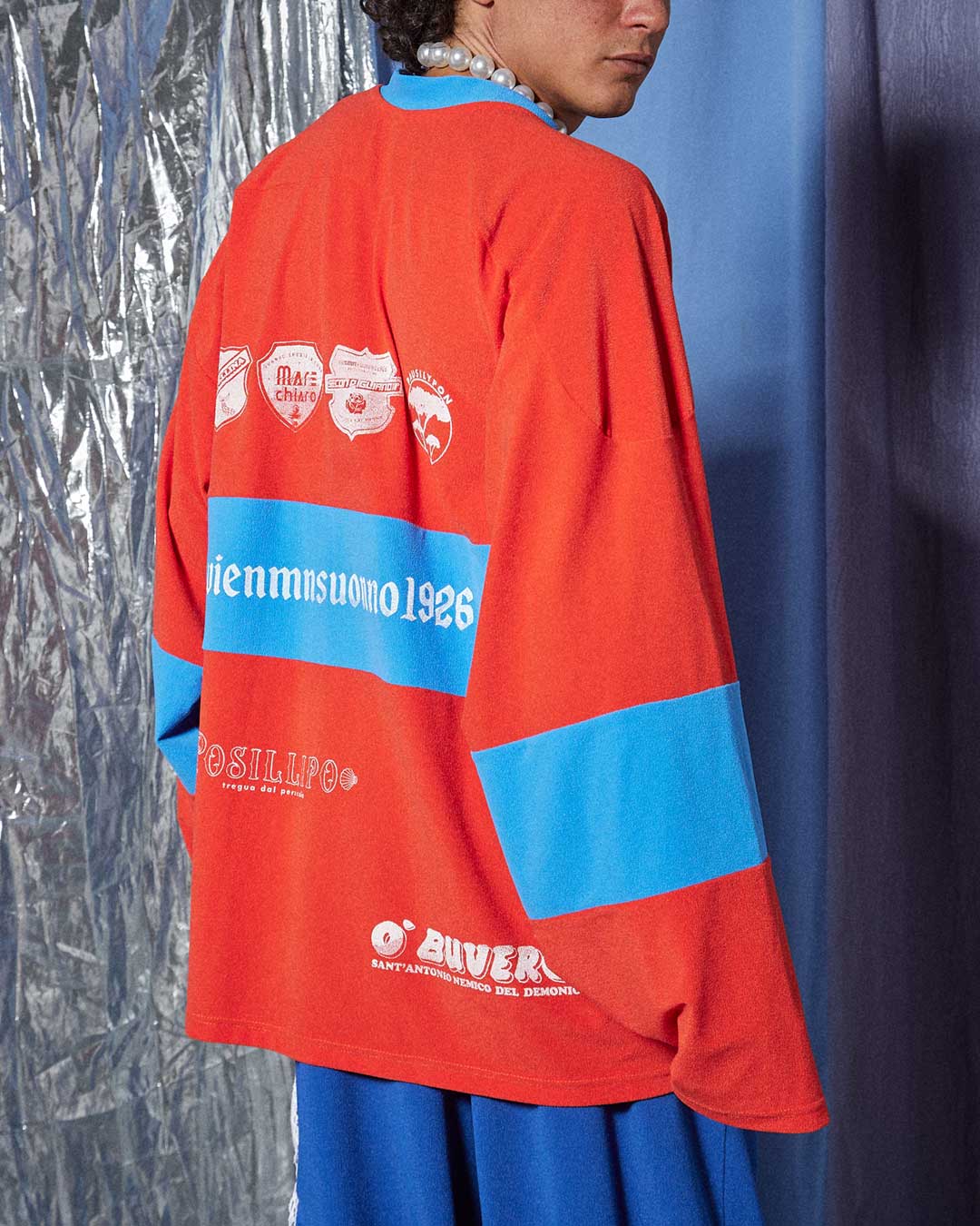 Felpa over modello hockey arancio con fascia e colletto azzurro, applicazione in tessuto chambray e ricamo.