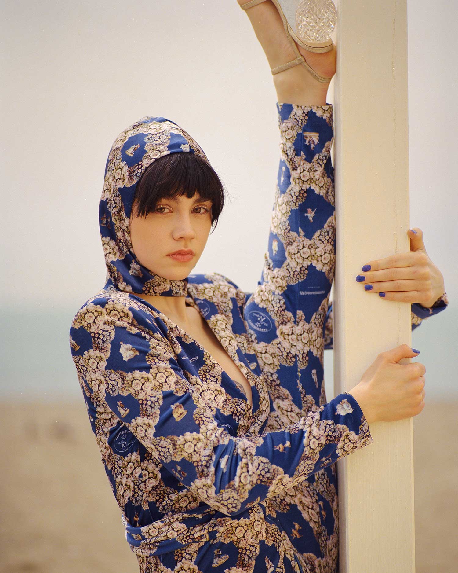 Annamaria indossa jumpsuit in ciniglia elasticizzata con stampa pattern porcellane di Capodimonte su fondo blu deep.