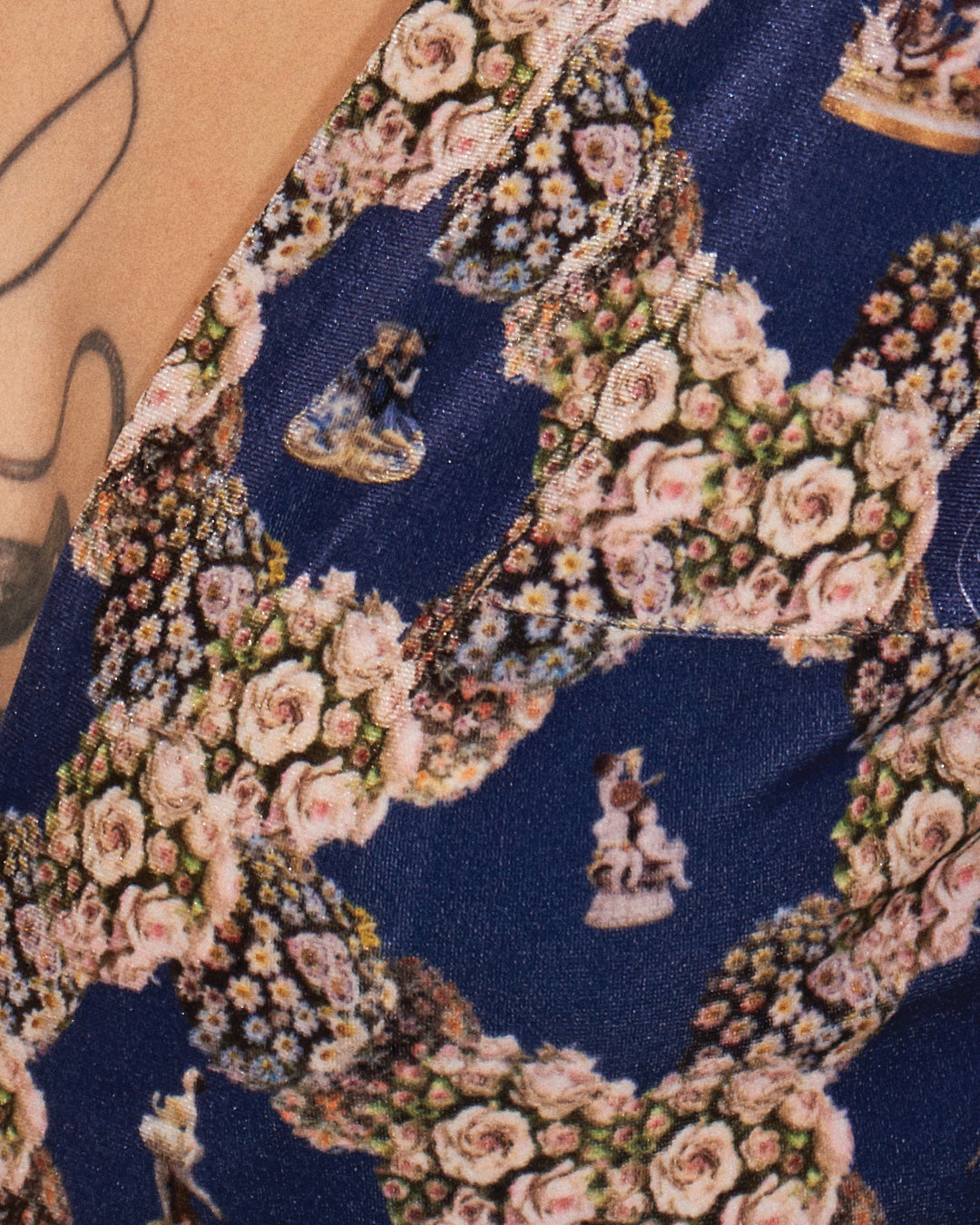 Annamaria indossa jump-suit in ciniglia elasticizzata con stampa pattern porcellane di Capodimonte su fondo blu deep