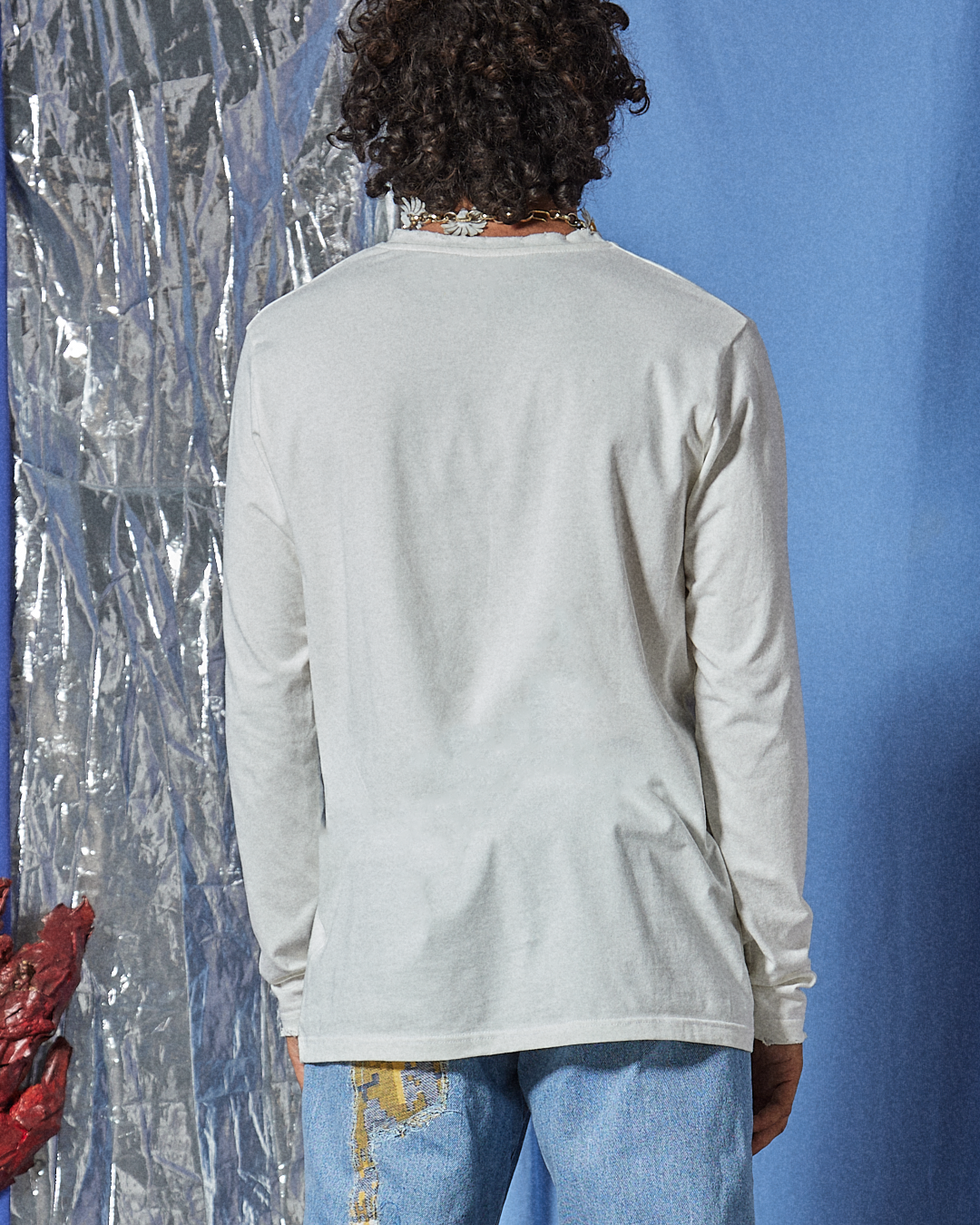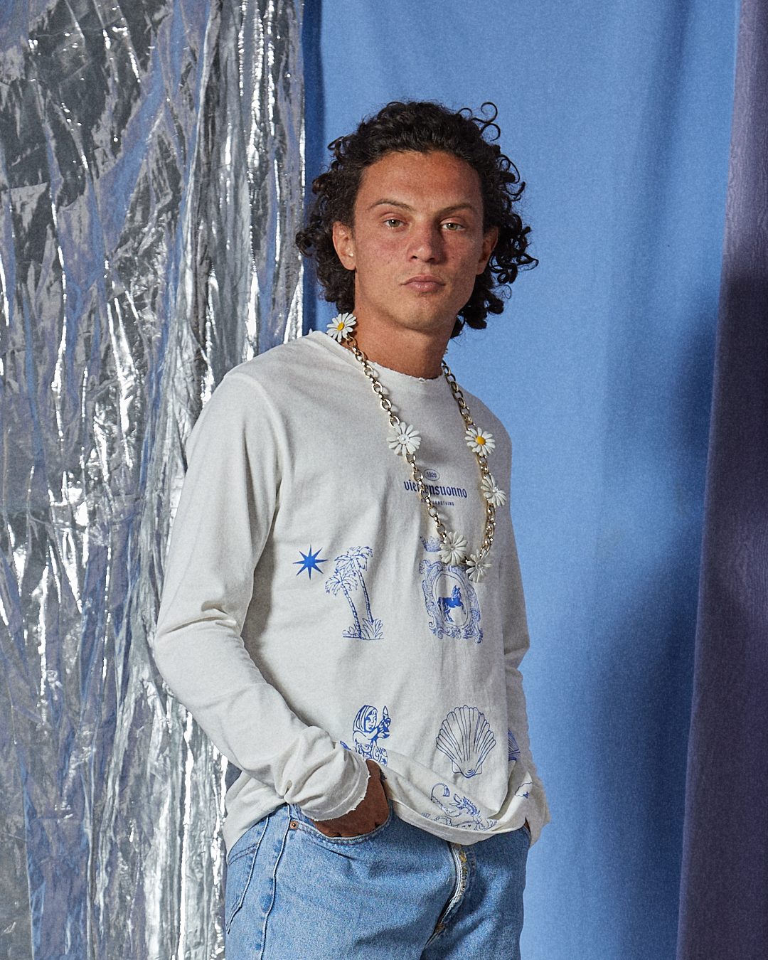 Vittoria indossa T-shirt longsleeve bianca con stampa serigrafica colore blu cobalto raffigurante simboli e leggende riguardanti la città di Napoli.