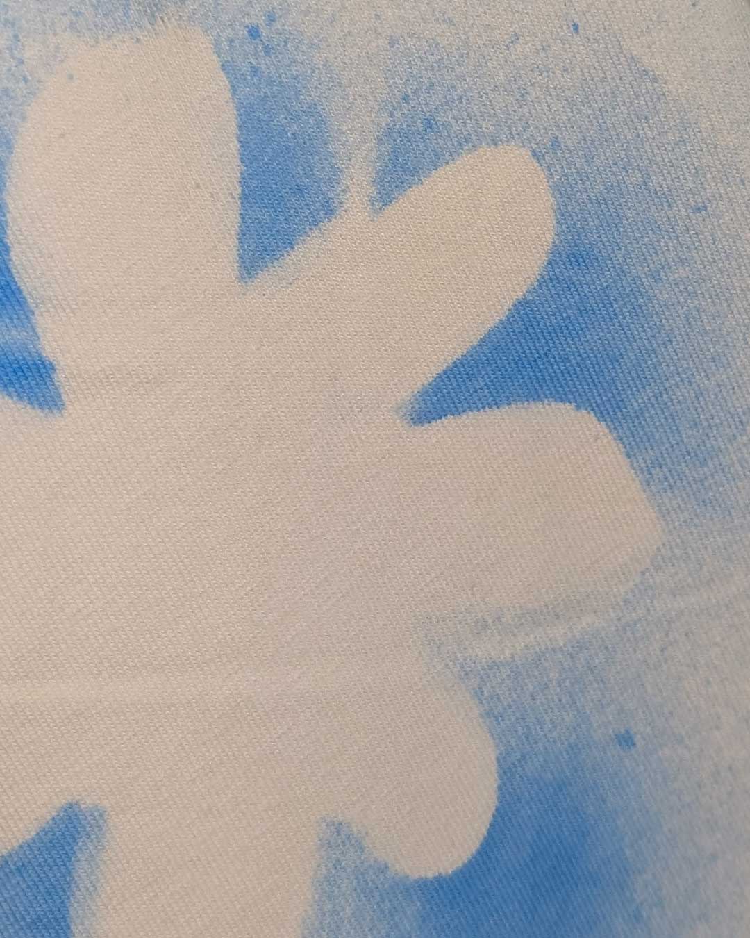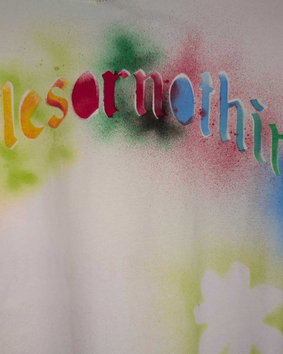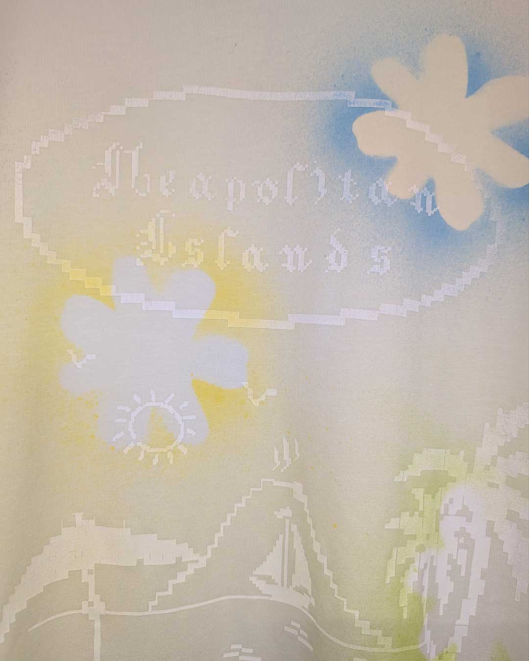 Enrico indossa T-shirt longsleeve panna con stampa serigrafica bianca sul fronte raffigurante un paesaggio isolano e sul retro stampa NAPLESORNOTHING, stampa effetto spray multicolor di fiori e elementi grafici.