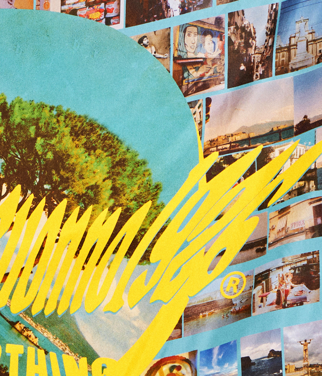 Foulard in seta stampa all over con pattern di fondo a motivo check azzurro e giallo Napoli con tampe fotografiche e logo centrale e claim “VIENMNSUONNO1926, NAPLES OR NOTHING”.