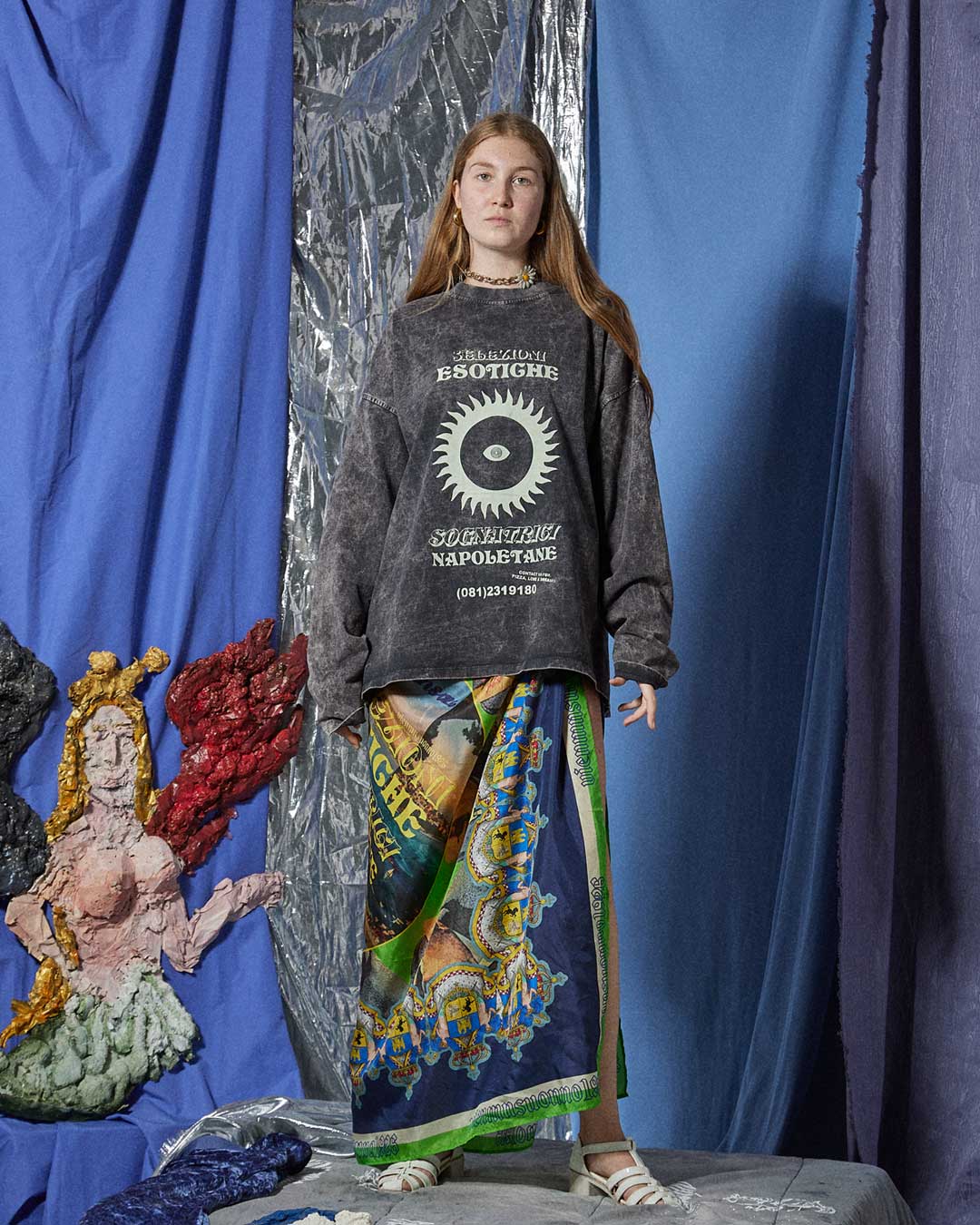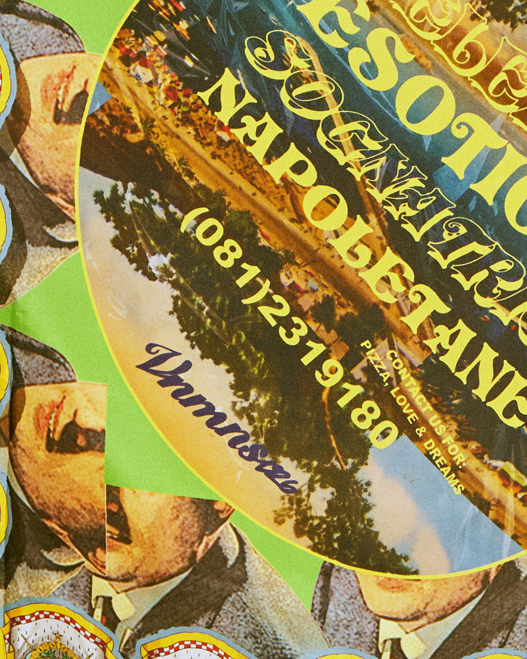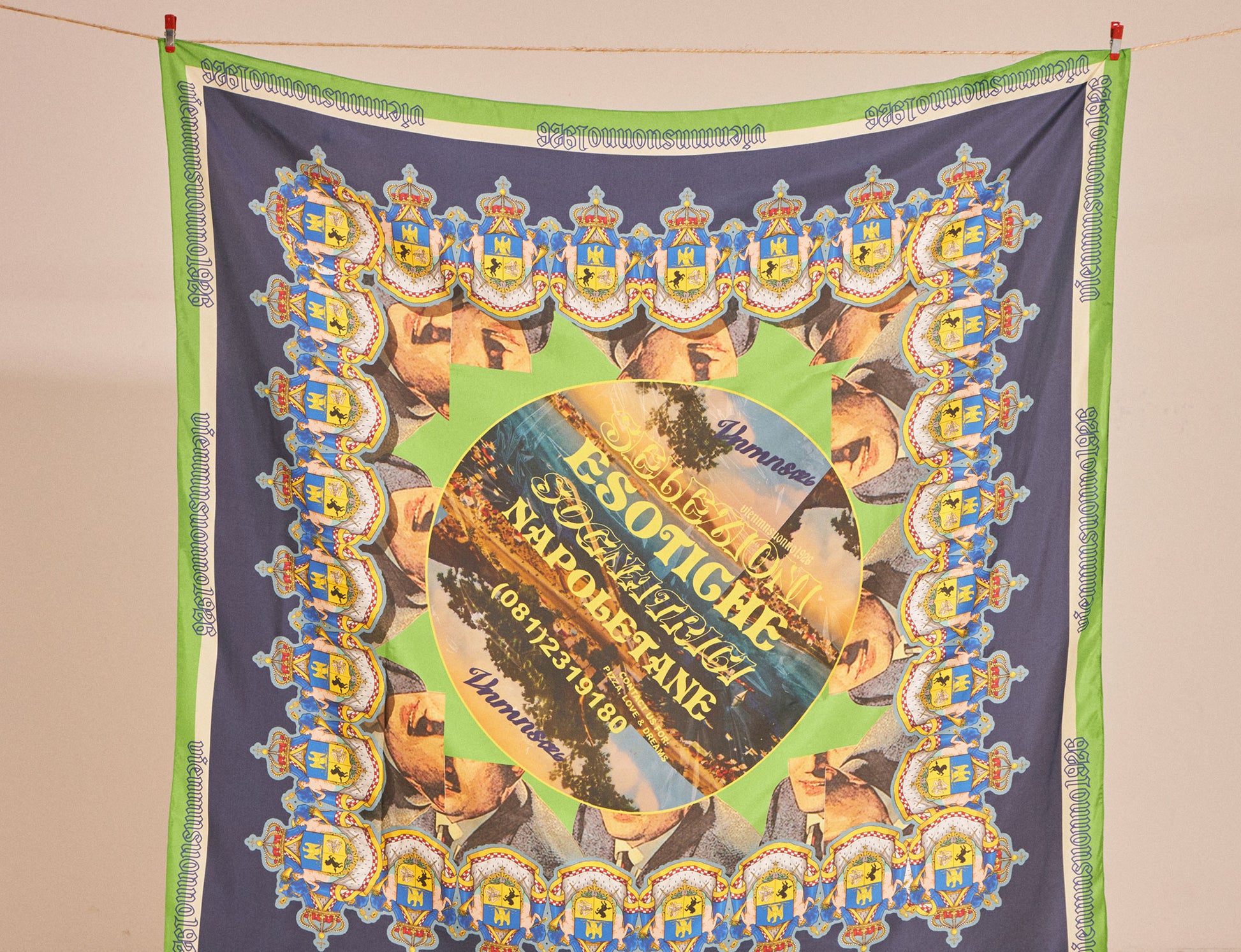 Foulard in seta stampa all over con fondo blu e viso di Sergio Bruni, mito della musica napoletana, circondato da una cornice formata da stemmi con sirena e claim centrale su paesaggio “SELEZIONI ESOTICHE SOGNATRICI NAPOLETANE”
