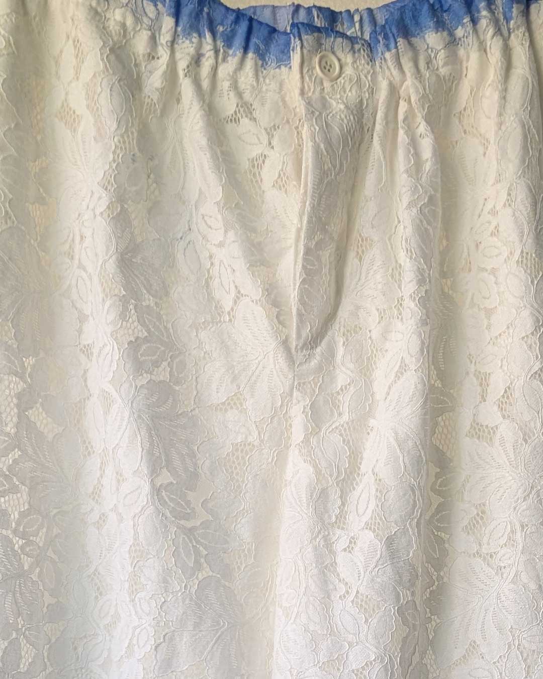 Enrico indossa pantalone a palazzo in pizzo panna con bottoni in madreperla cuciti a mano e tasche laterali.
