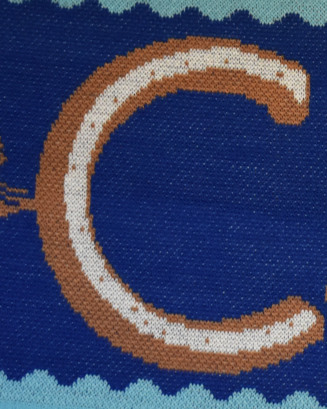 Sciarpa in jacquard in quattro colori double face. La grafica riporta l'antico nome del quartiere "CHIAJA la via de la playa" e le palme che identificano la riviera di Chiaia.