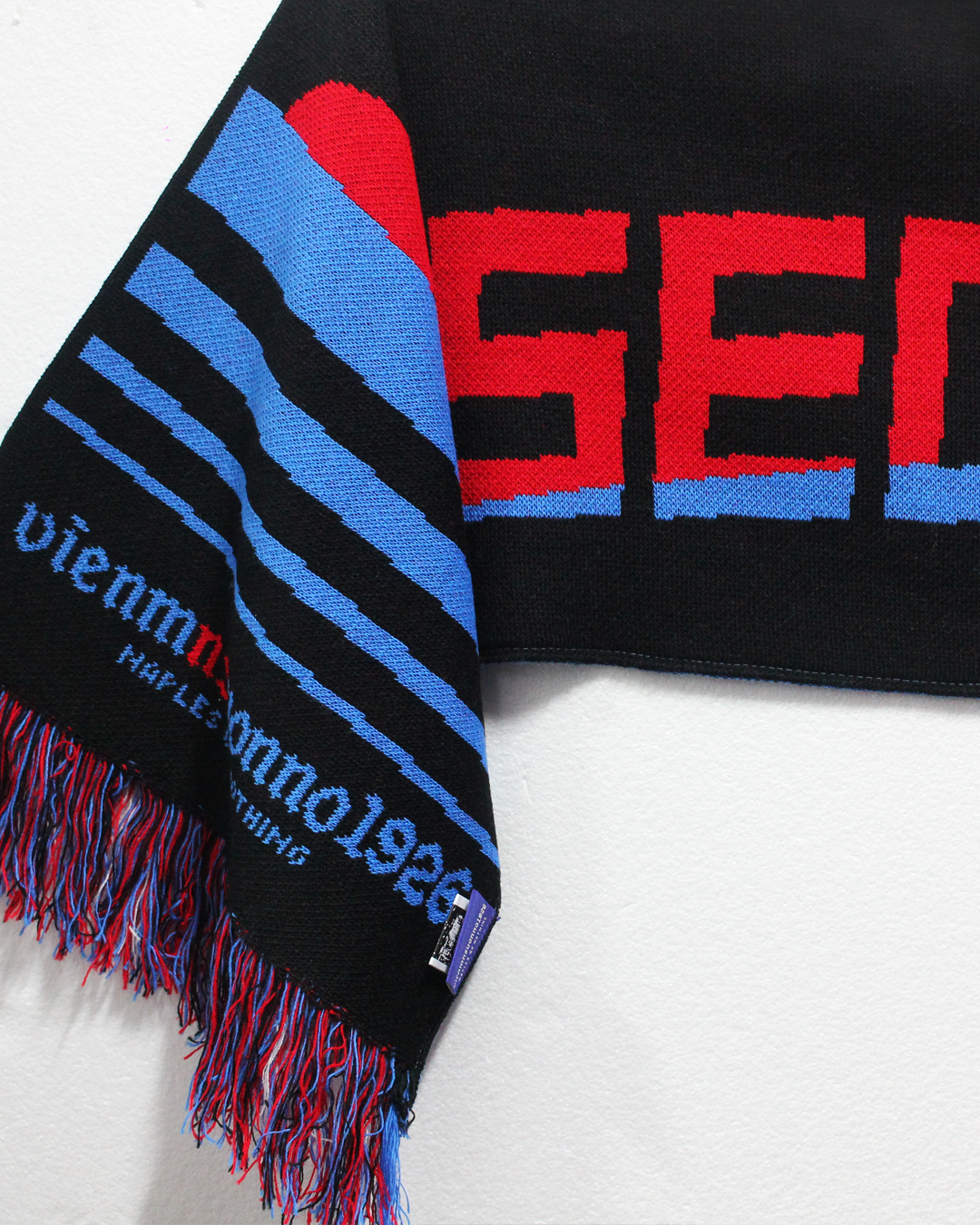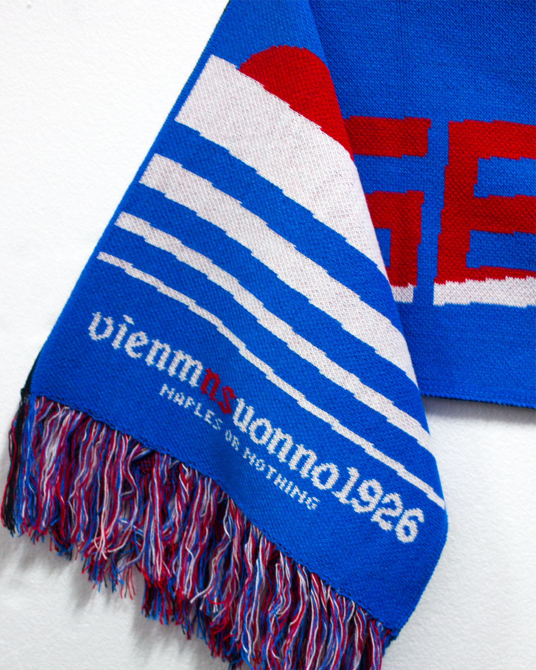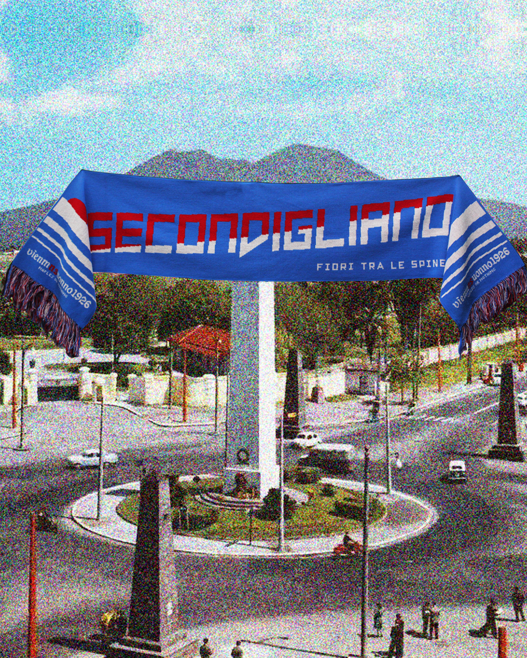 Un lato fondo blu, l'altro fondo nero con scritta “SECONDIGLIANO fiori tra le spine” la grafica riprende le architetture delle vele bianco e magenta.
