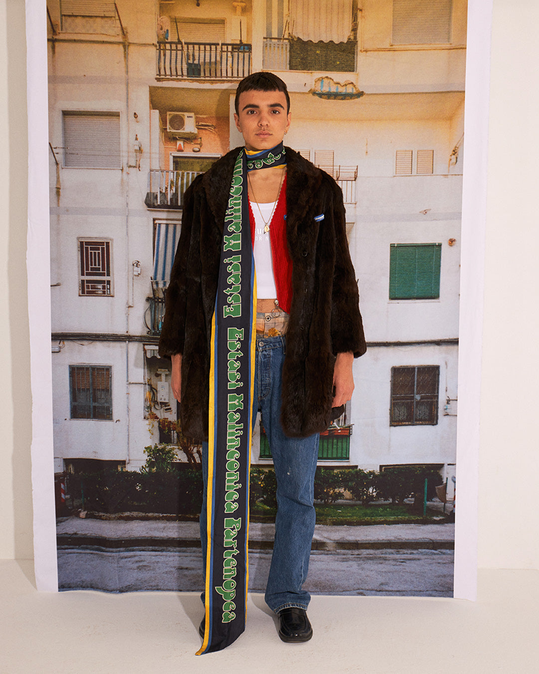 Sciarpina in seta con stampa all over fondo blu marino con claim “ Estasi malinconica partenopea” in verde.