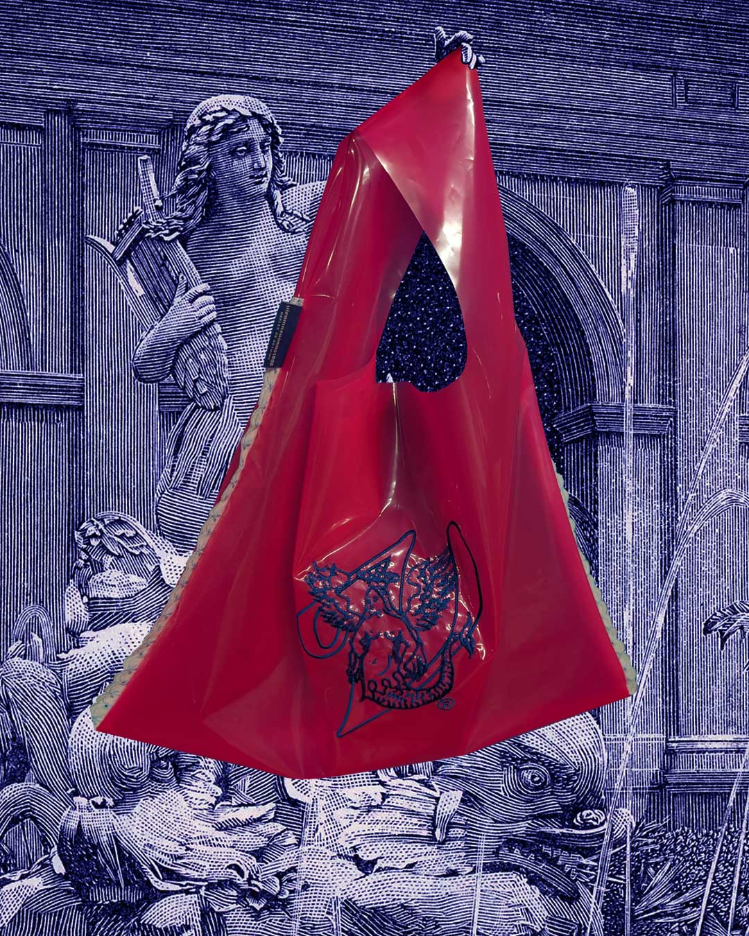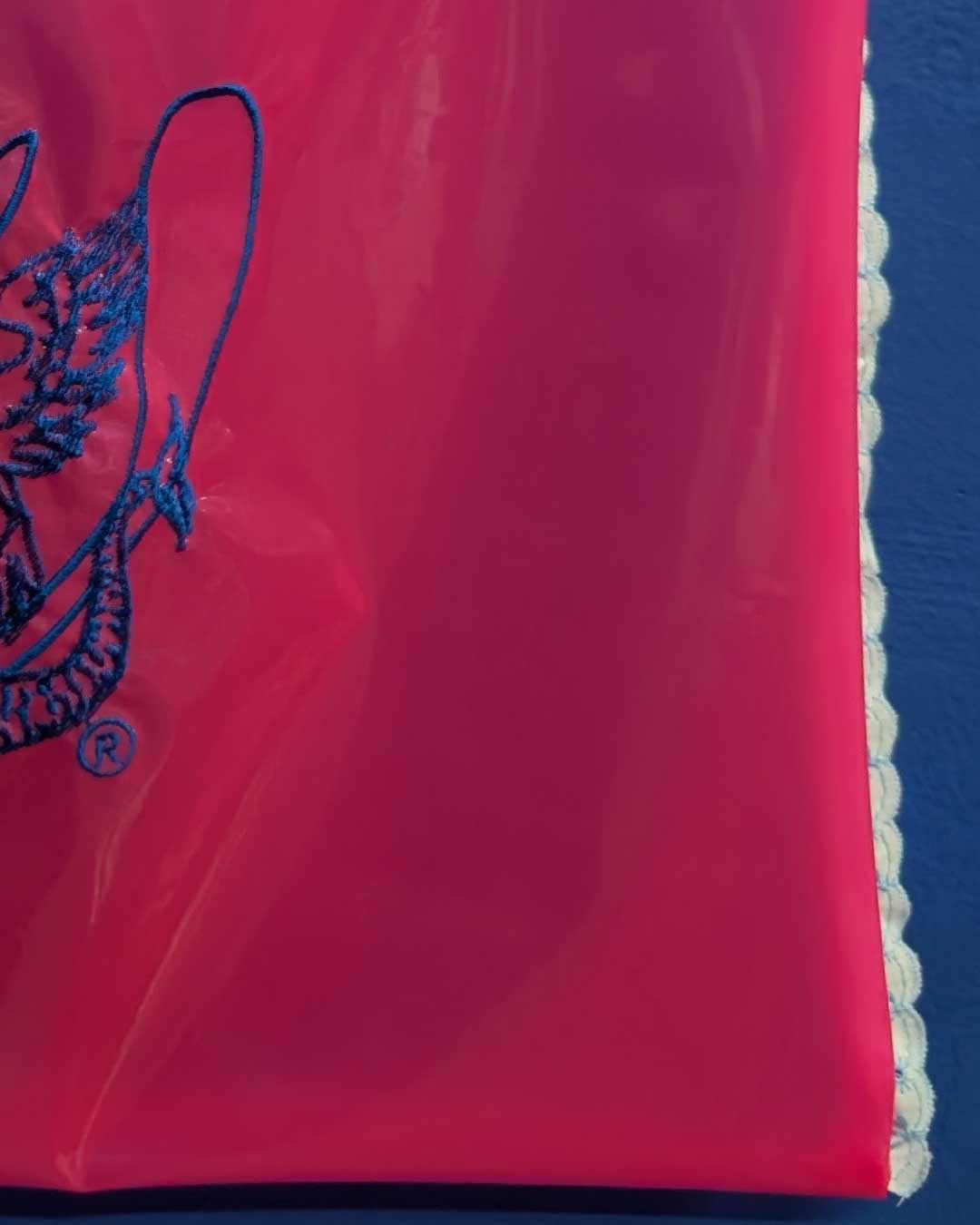 Shopper rosa fluo in poliuretano con ricamo sul fronte di sirena blu. Passamaneria vintage bianca e azzurra laterale.