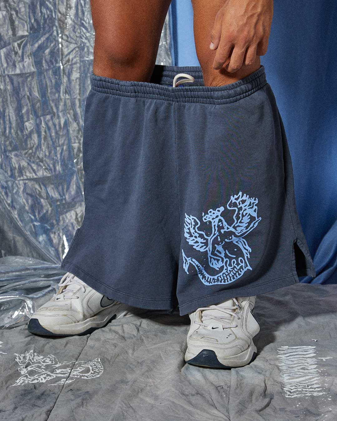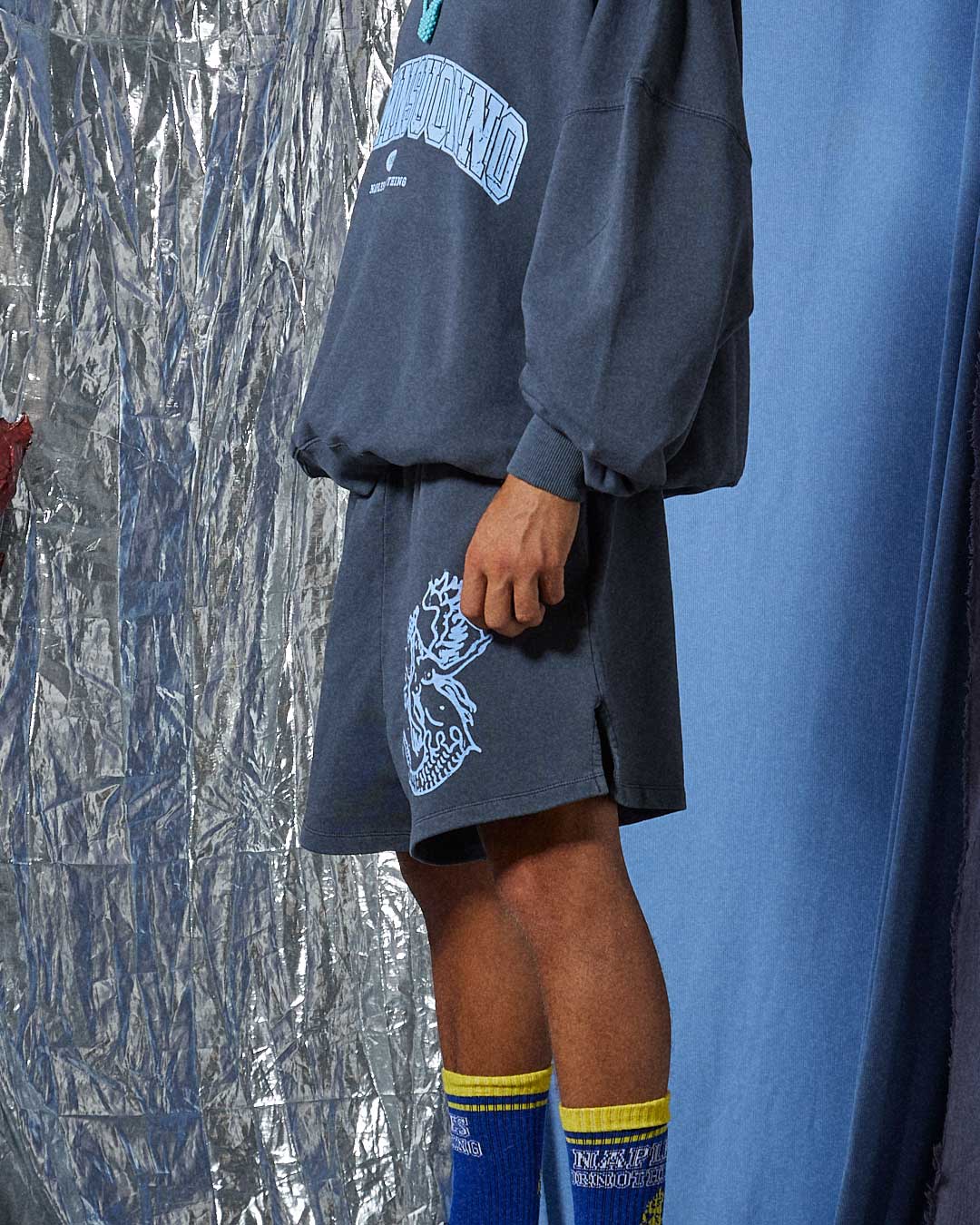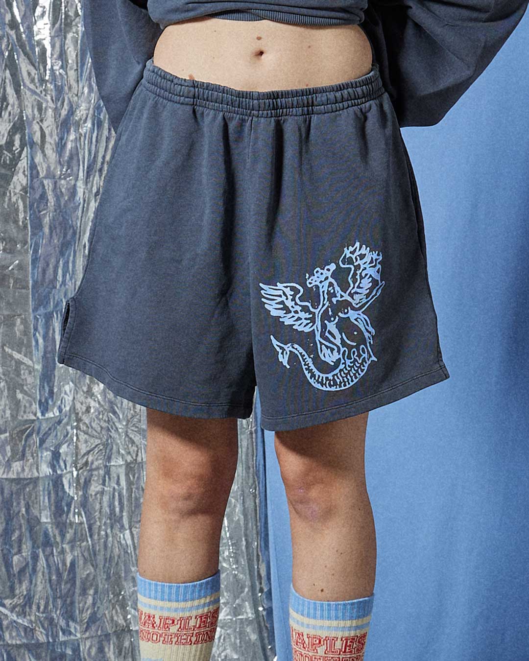 Short in felpa over con tasche laterali e spacchetti al fondo stampa serigrafica azzurra di sirena sul fronte e scritta sul retro.