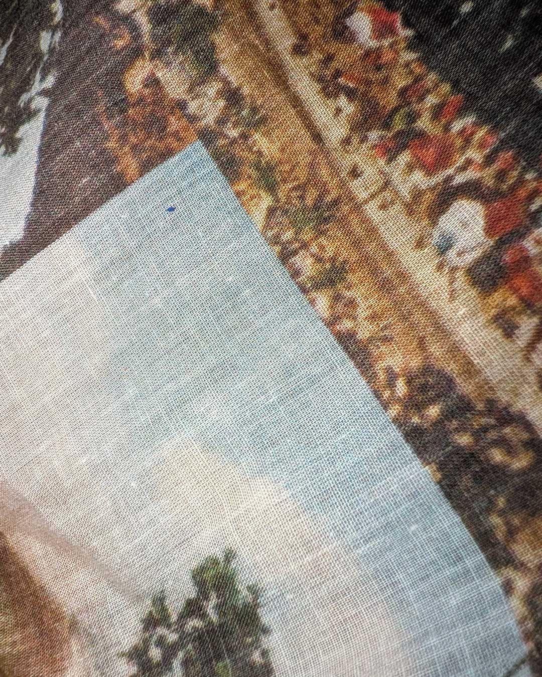 Beatrice indossa short in vera pelle effetto invecchiato, con taglio a vivo, vita bassa, chiusura con bottone a pressione in ottone laserato e cerniera lampo, interamente foderato con tessuto voille di cotone con stampa all over che fuoriesce creando una balza.