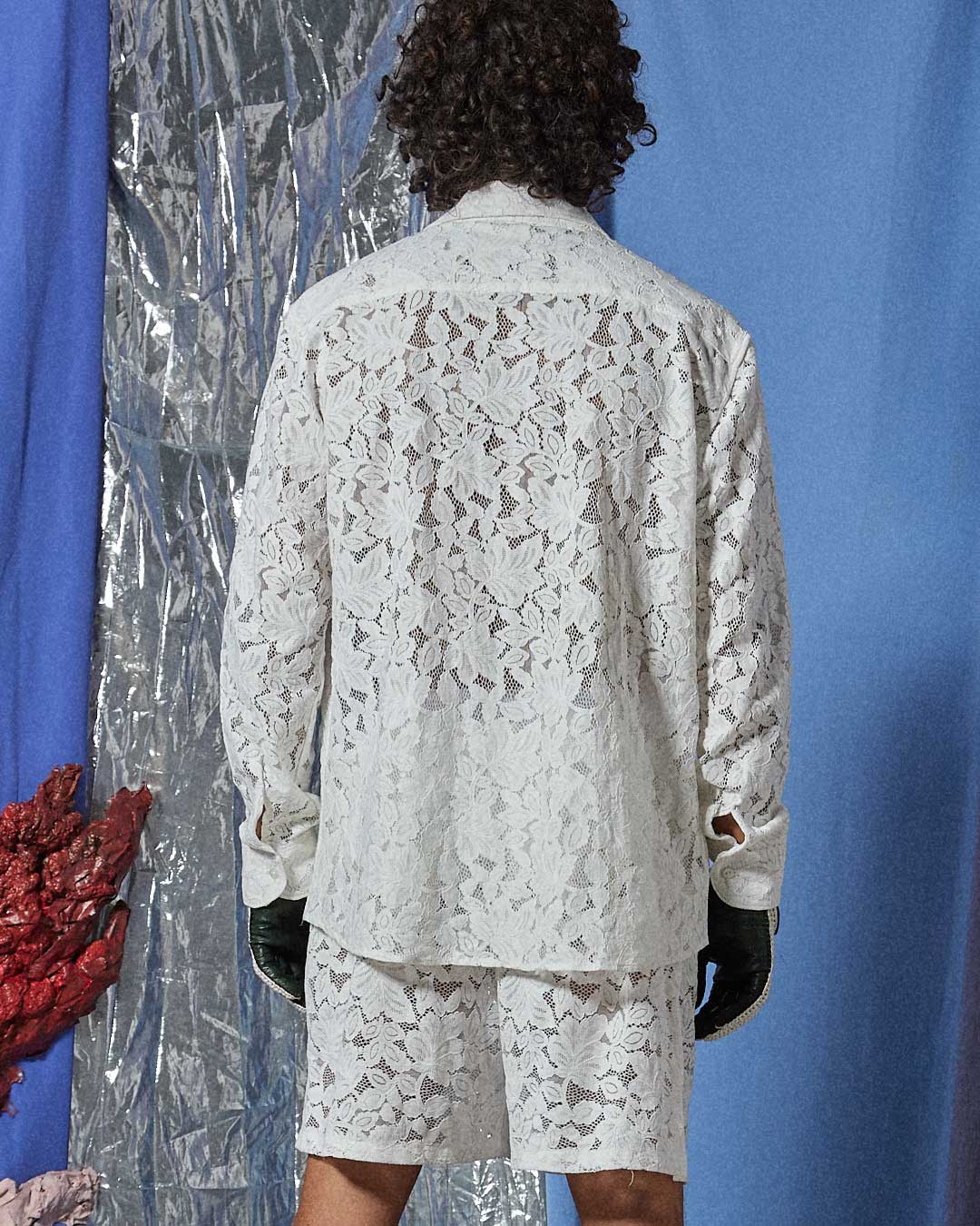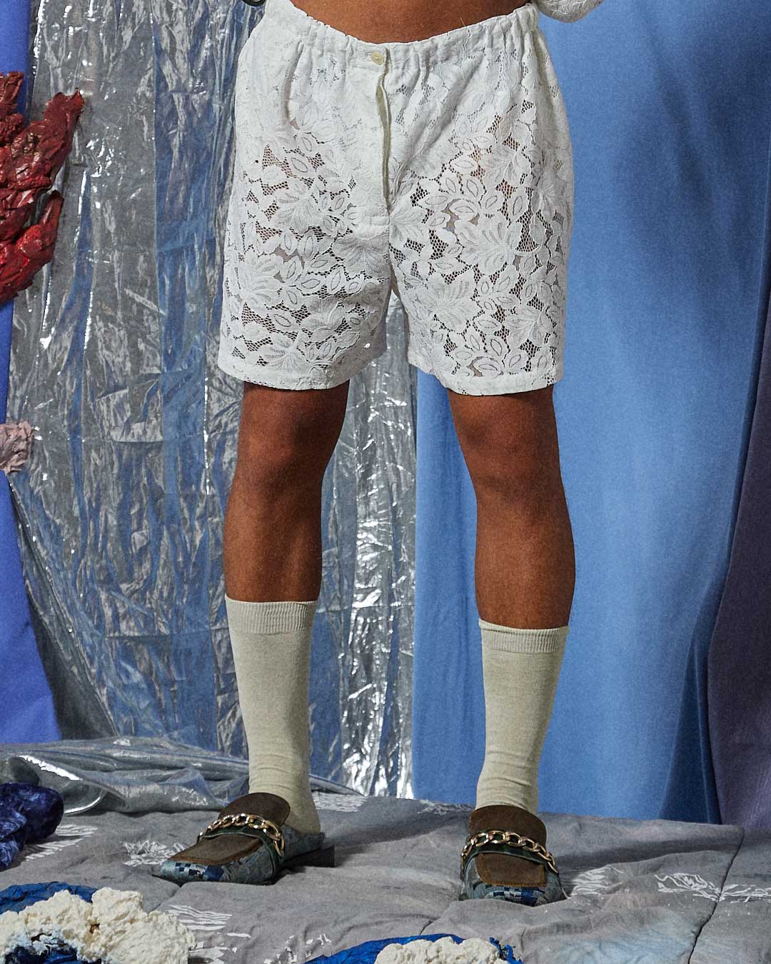 Short in pizzo panna con bottoni in madreperla cuciti a mano e tasche laterali.