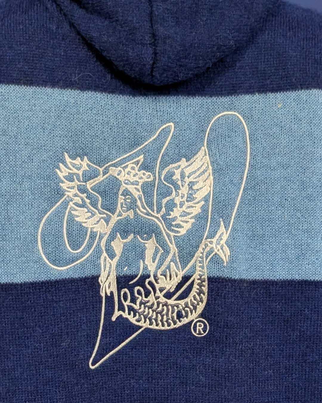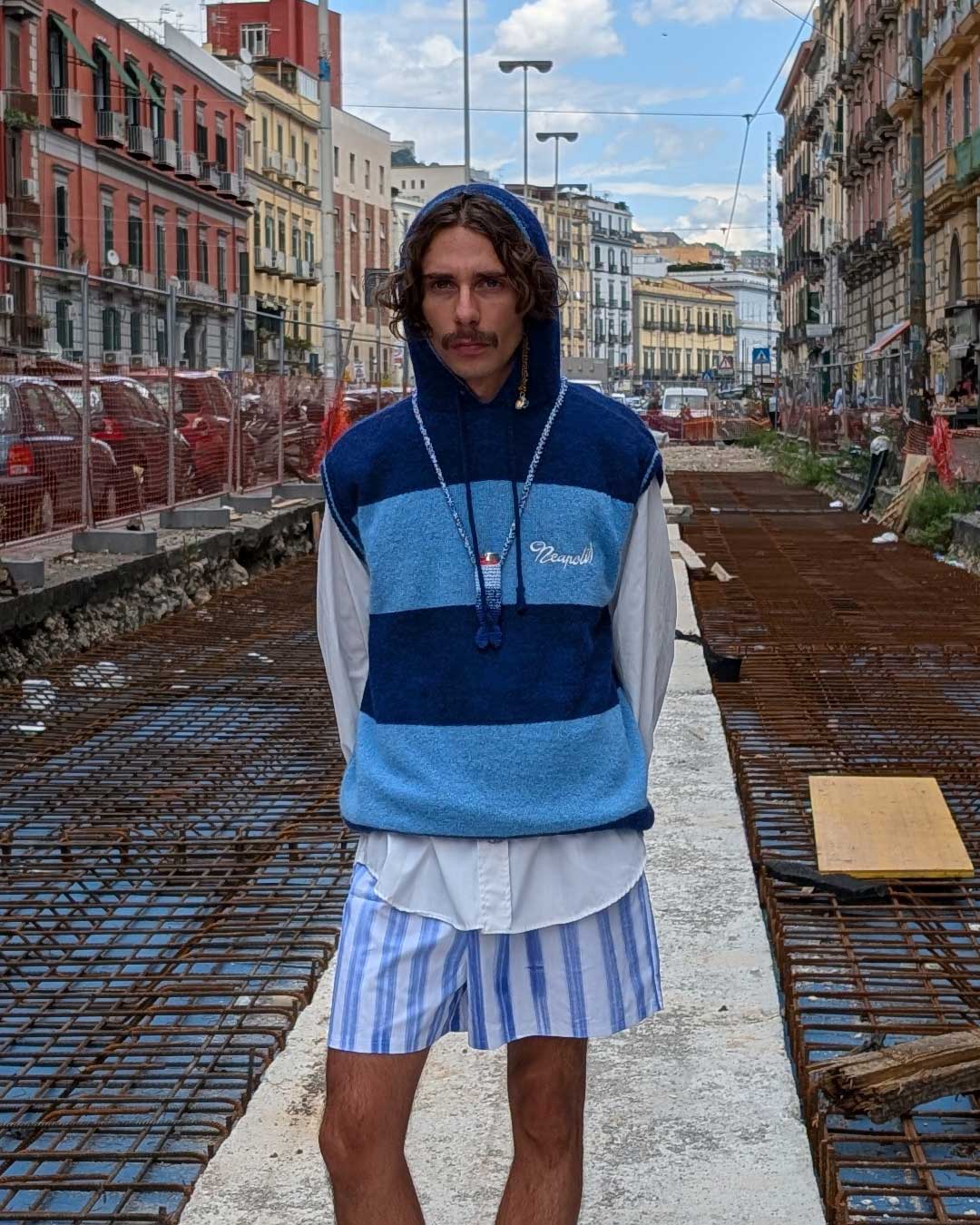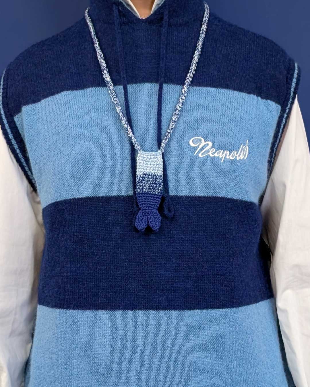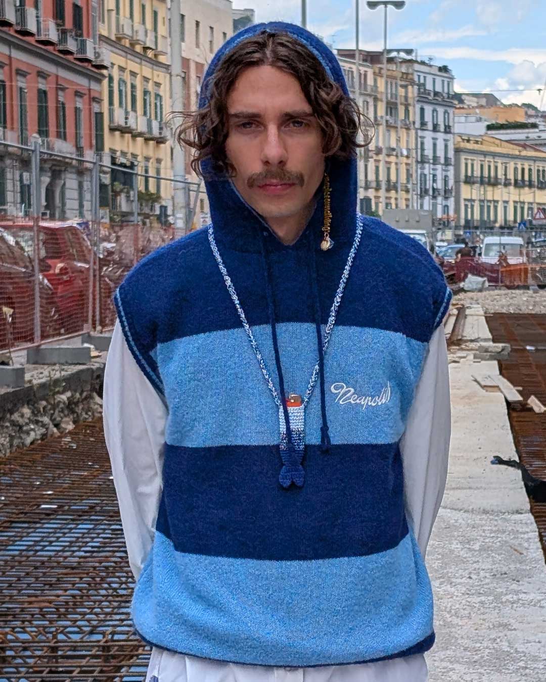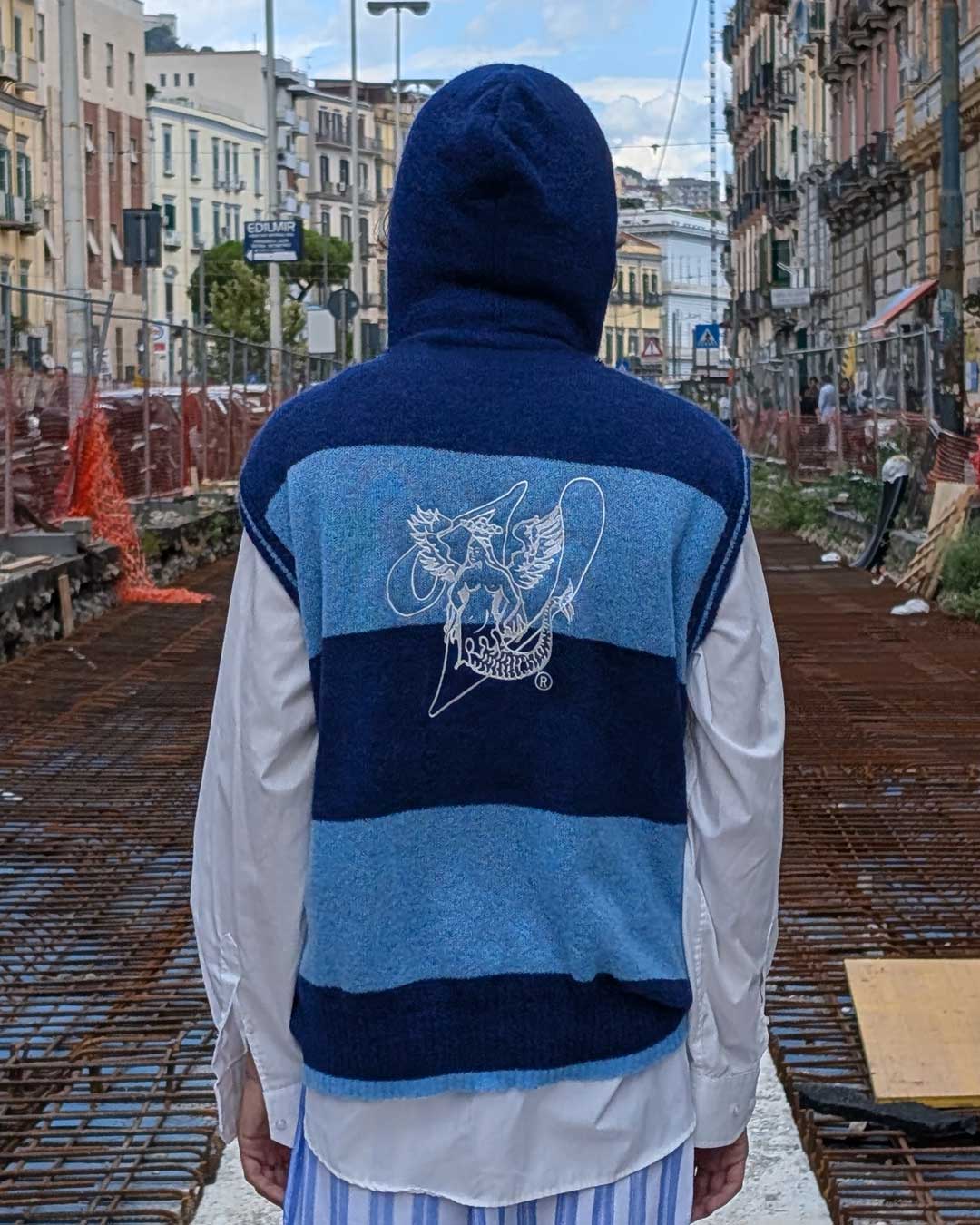 Dominique indossa smanicato over jacquard in lana mohair e baby alpaca a fasce blu e azzurro con cappuccio e ricami off white sul fronte e sul retro.