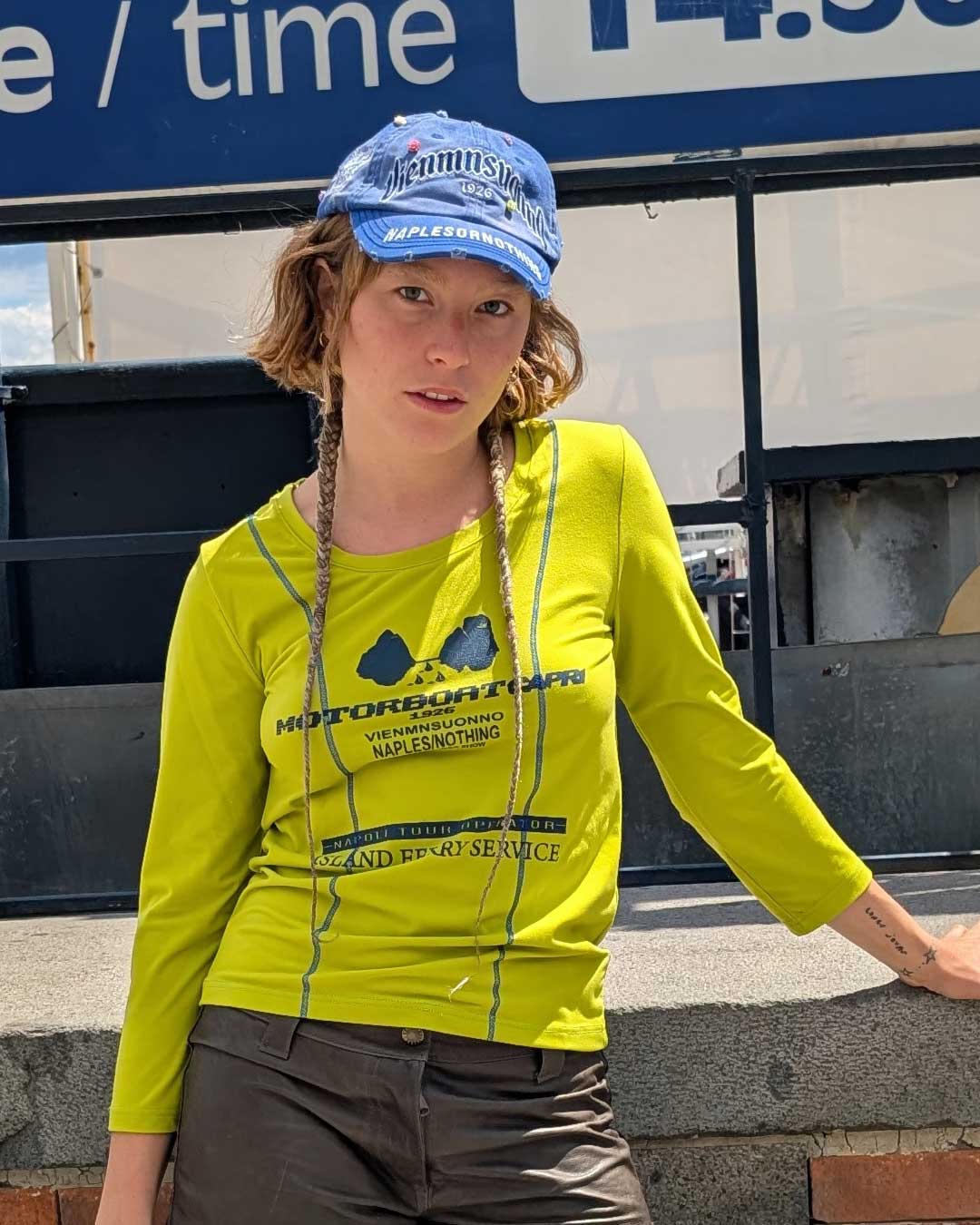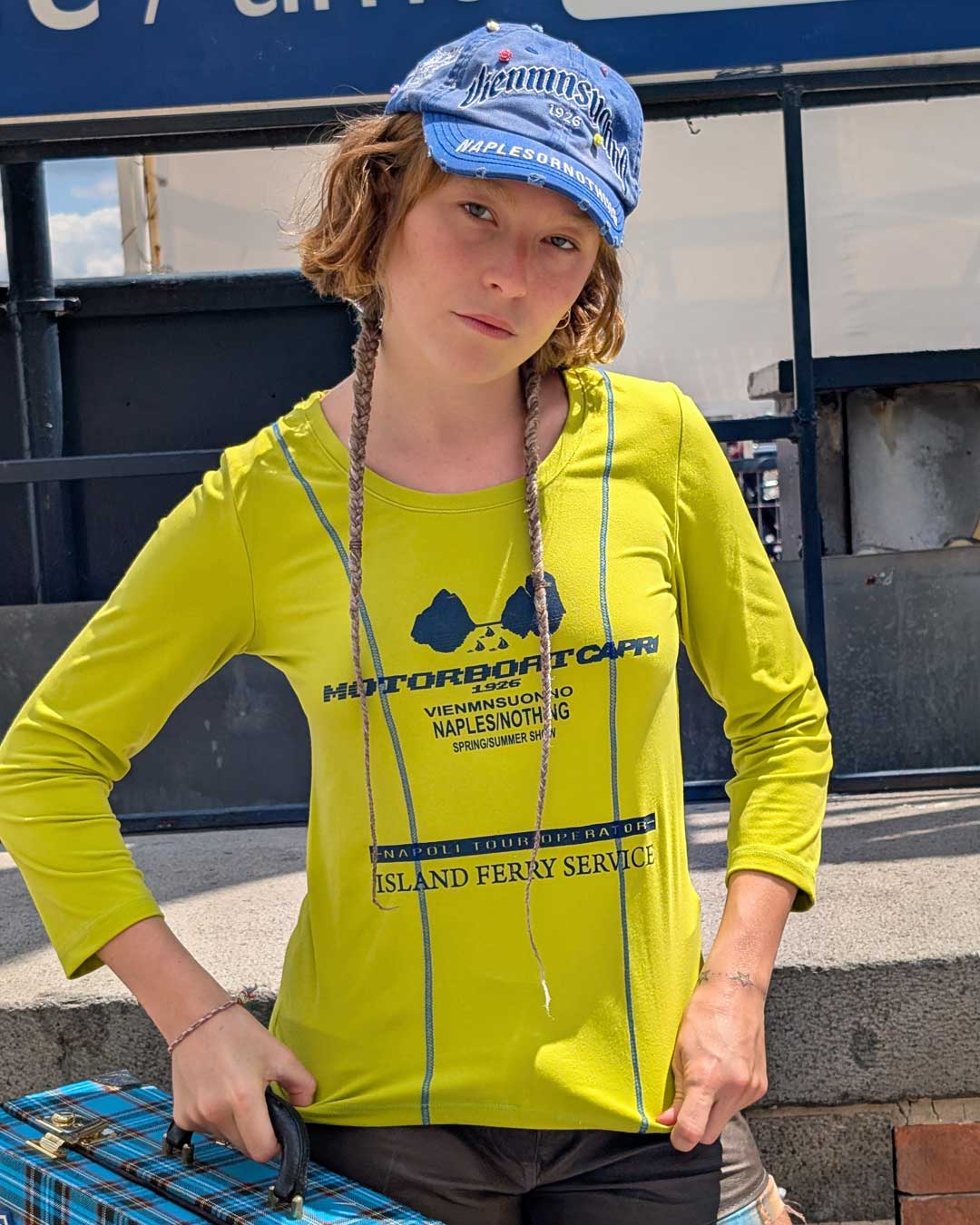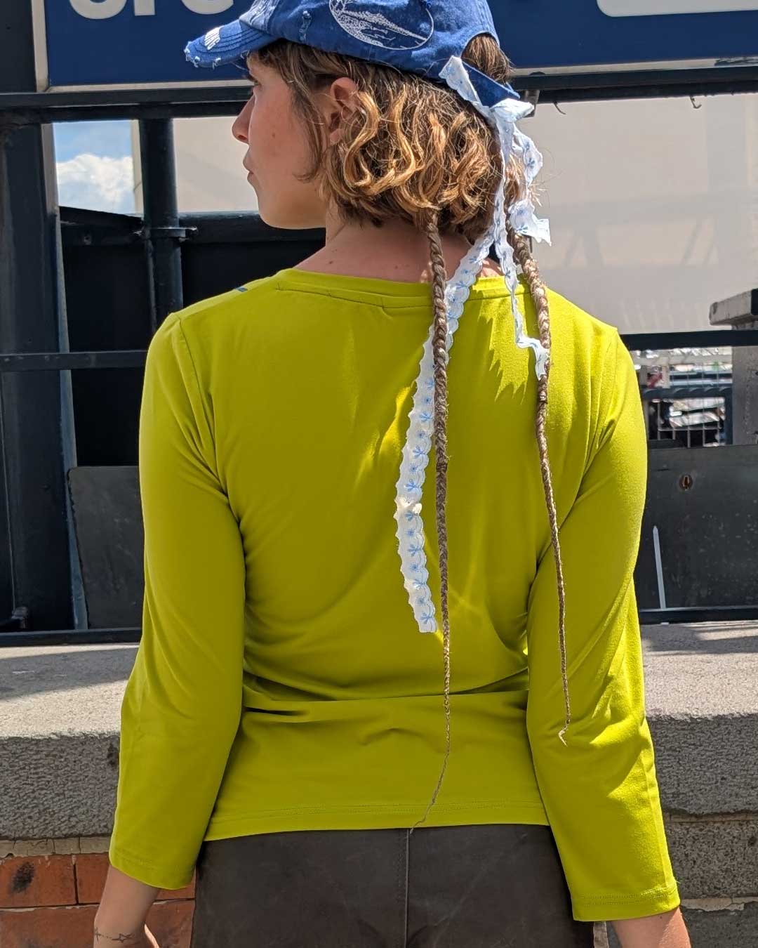 Beatrice indossa t-shirt color pistacchio con maniche a tre quarti in tessuto riciclato verde pistacchio con cuciture a contrasto sul davanti blu.