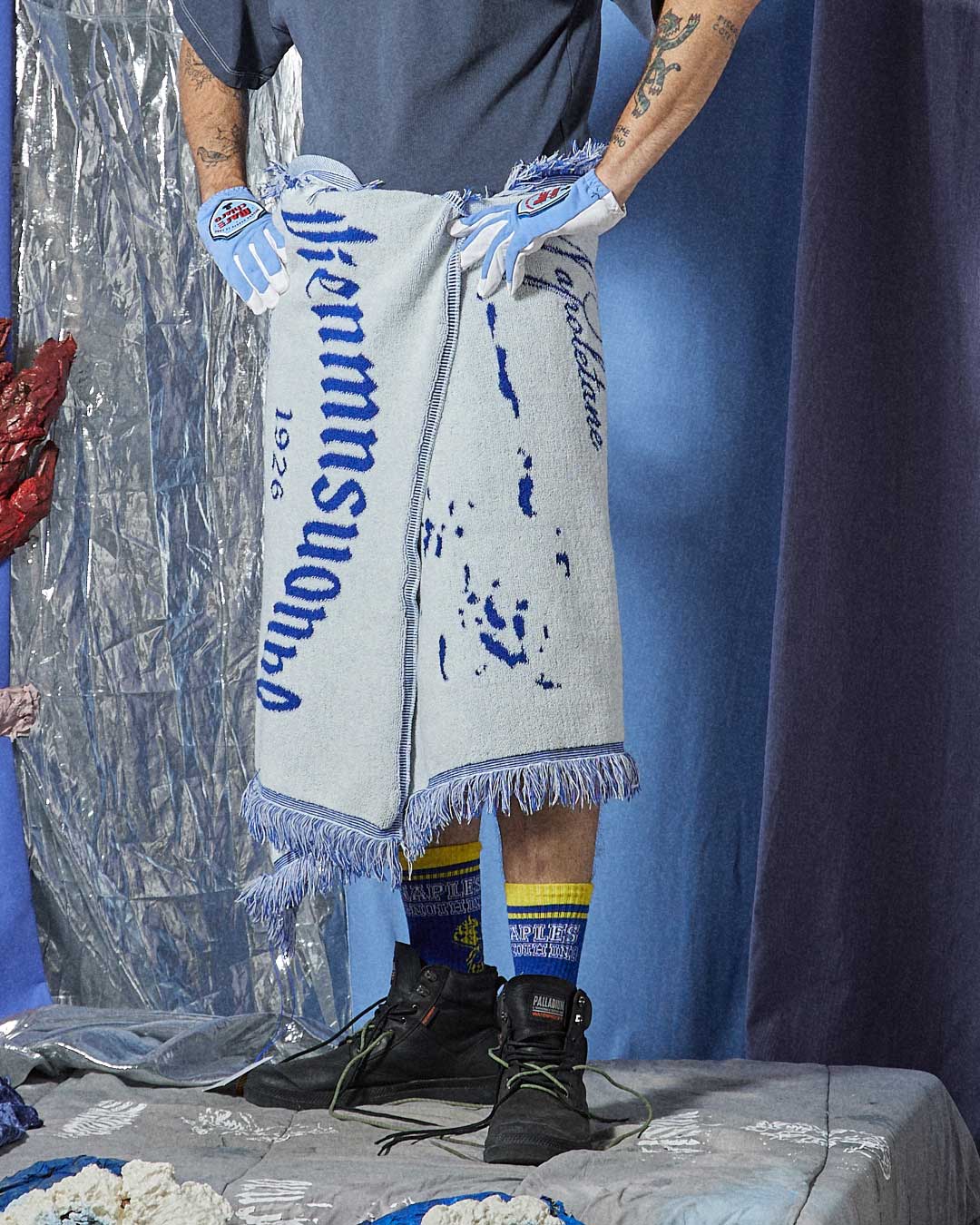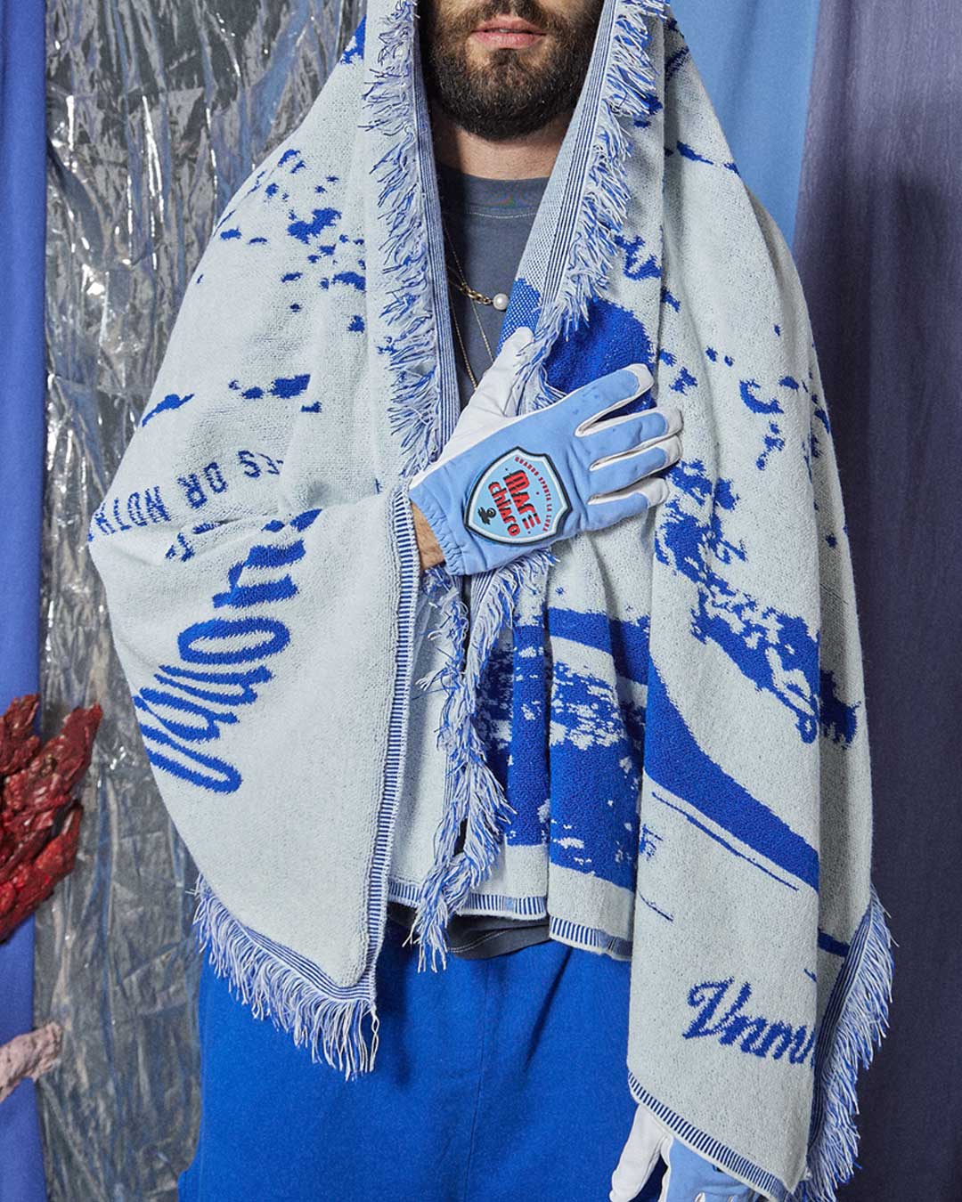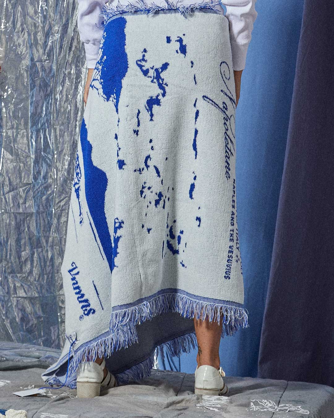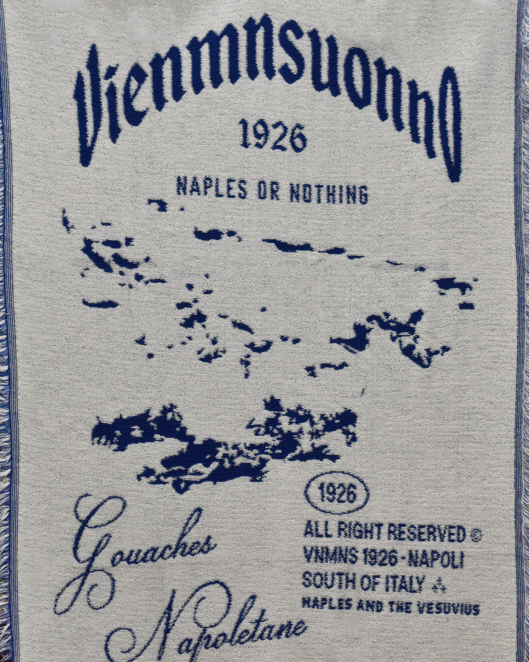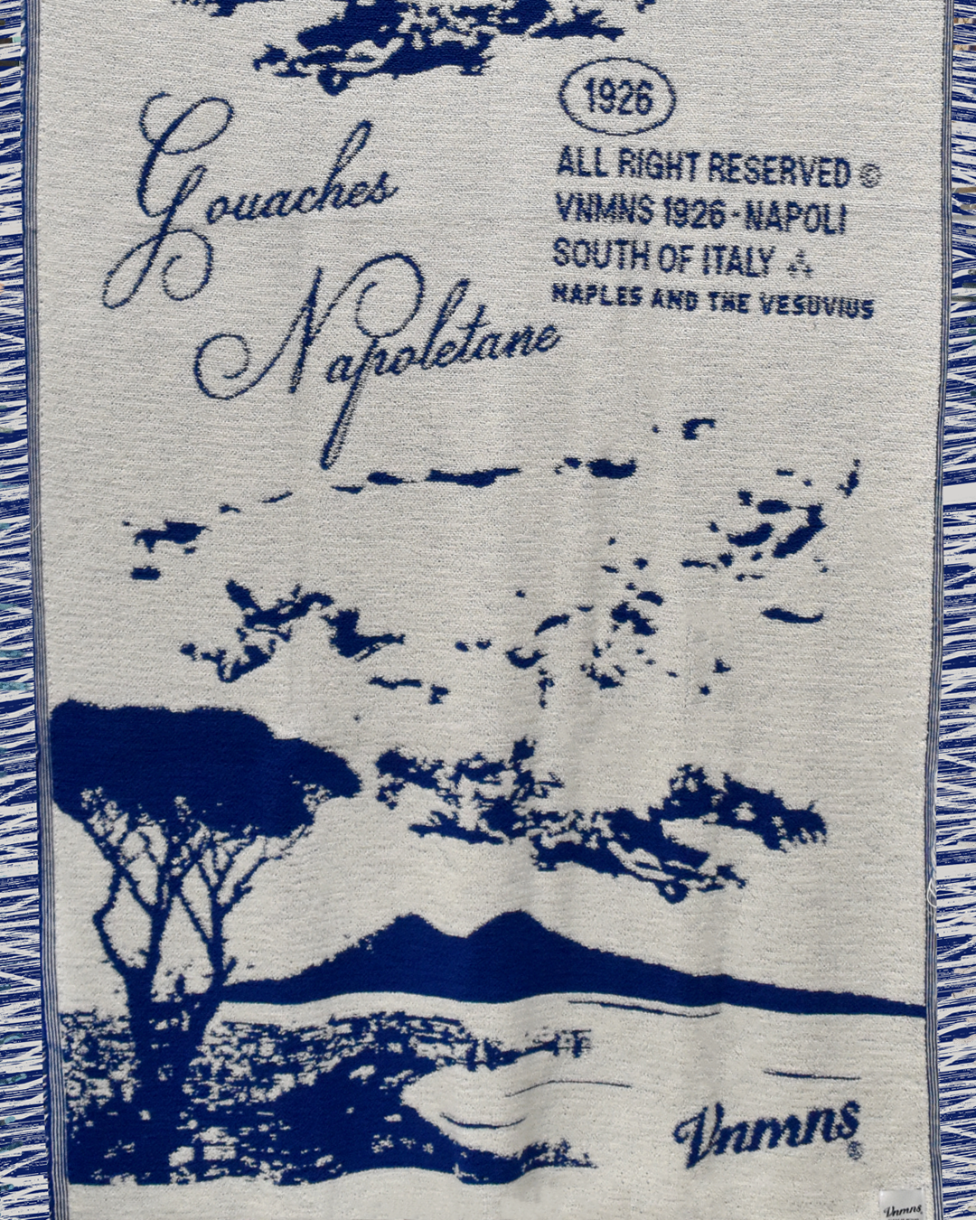 Telo in spugna bianco e blu, raffigurante una veduta di Napoli realizzato con la tecnica del jacquard , frange laterali in tono.