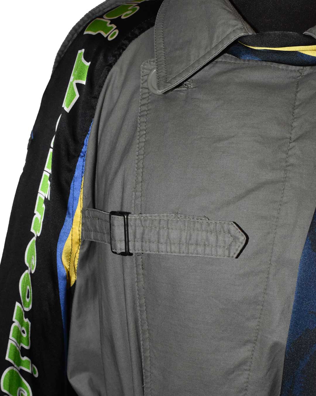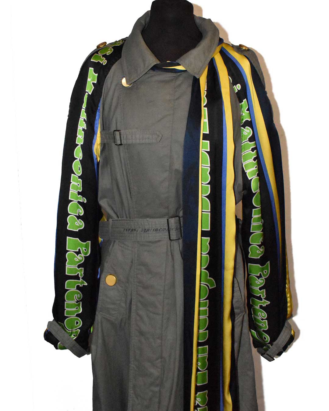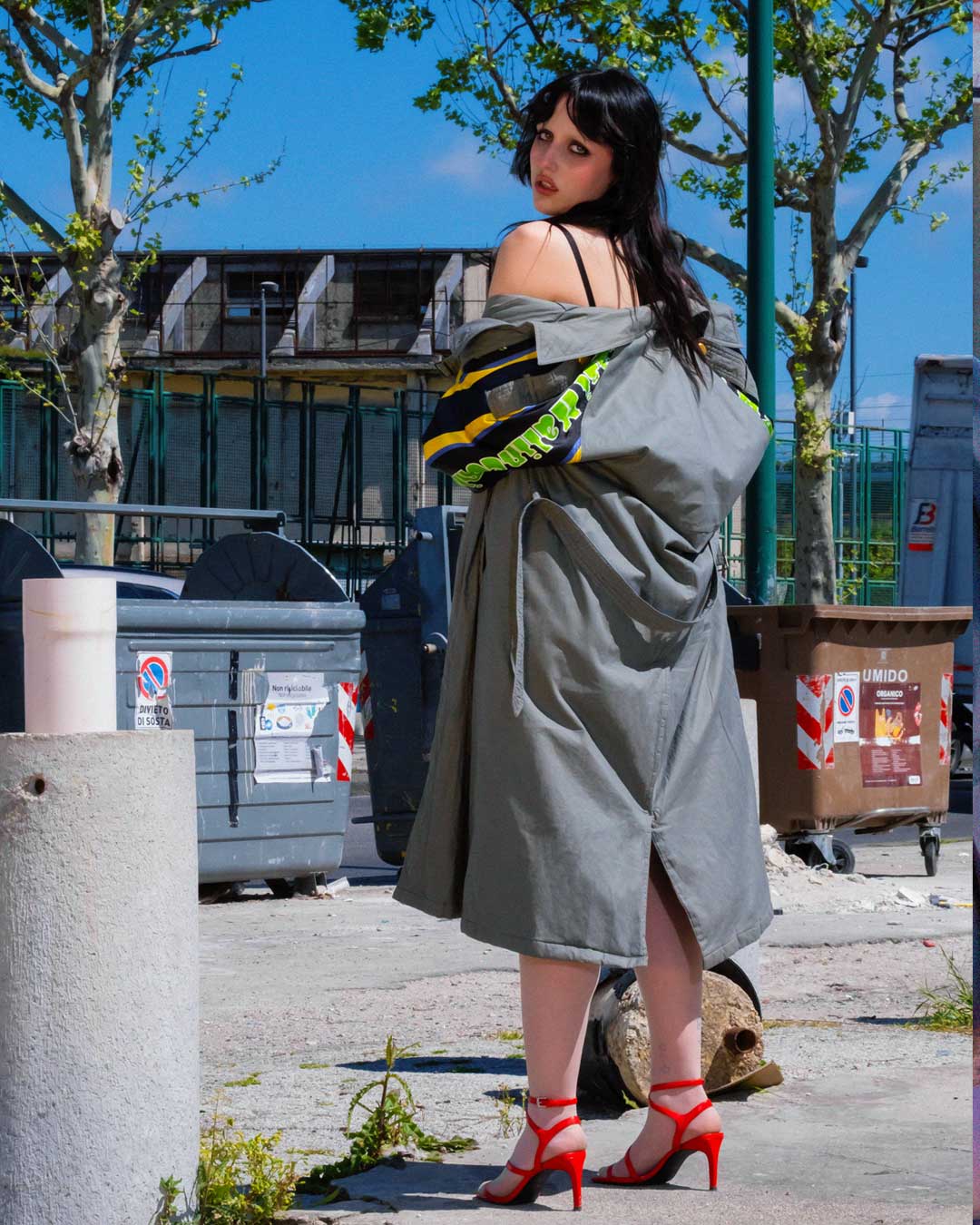 Chiara indossa trench monopetto over grigio, con cintura in vita e cinturini alle maniche, sul retro martingala, abbottonatura laterale, cinta stampata in serigrafia con claim "Estasi malinconica partenopea" ripreso negli inserti in seta sulle maniche.