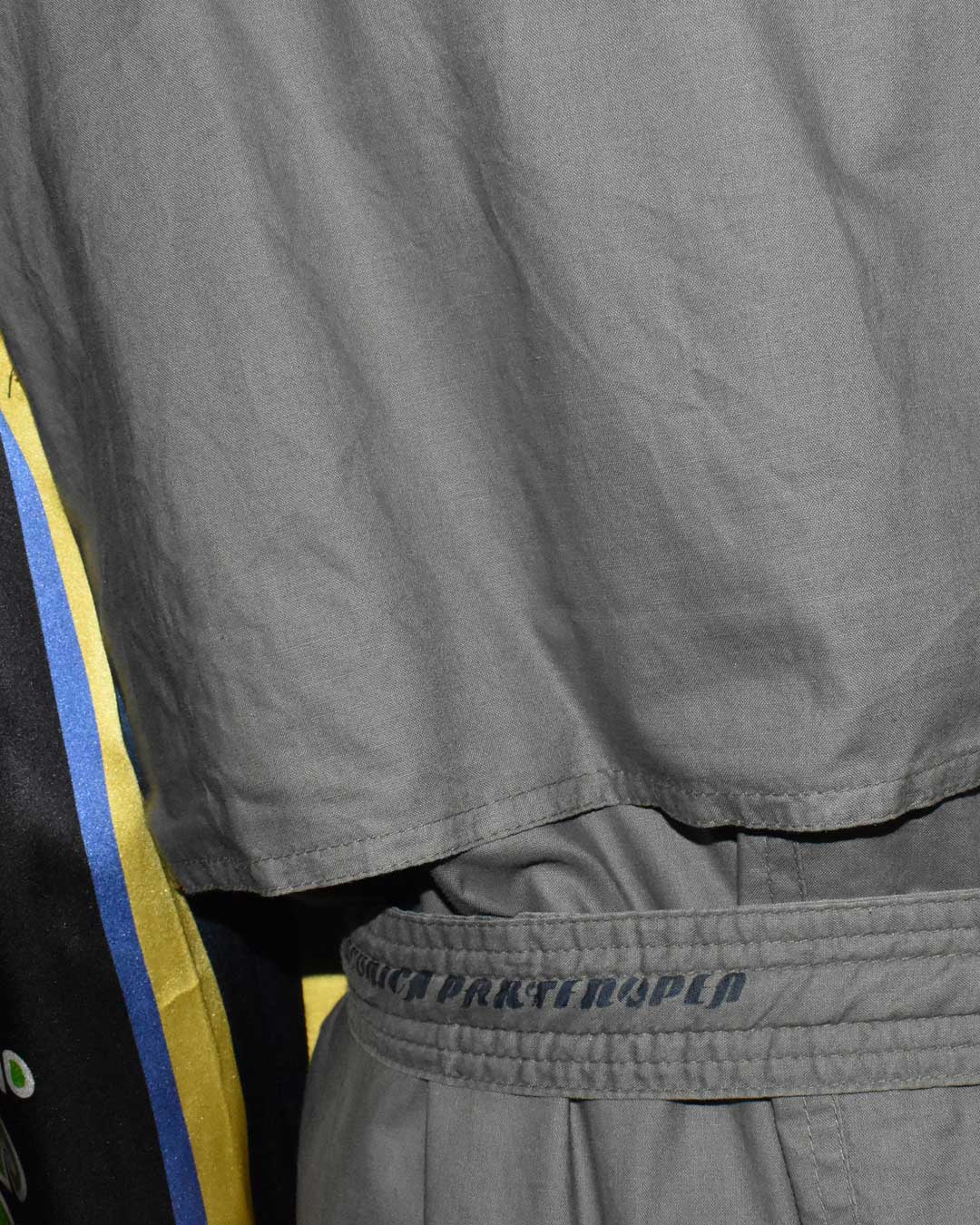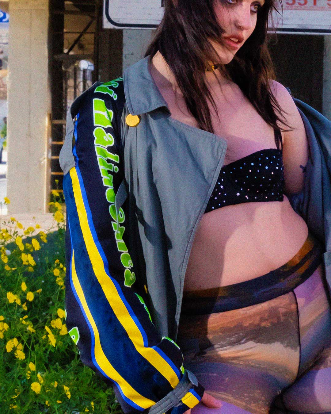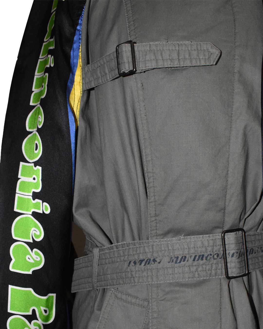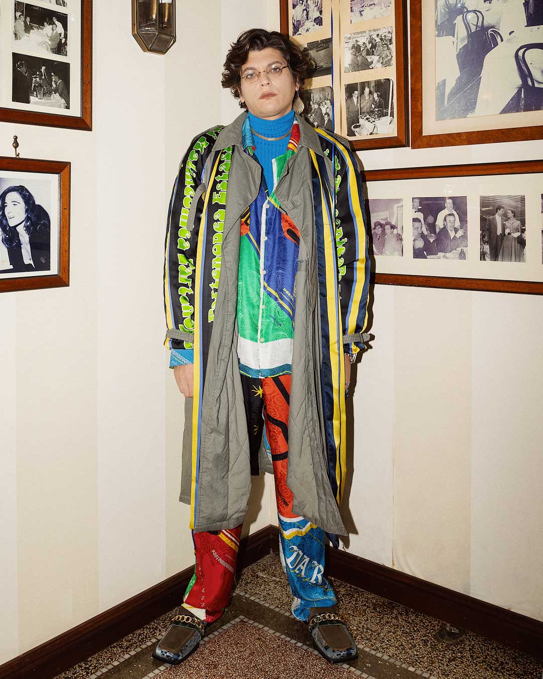 Chiara indossa trench monopetto over grigio, con cintura in vita e cinturini alle maniche, sul retro martingala, abbottonatura laterale, cinta stampata in serigrafia con claim "Estasi malinconica partenopea" ripreso negli inserti in seta sulle maniche.