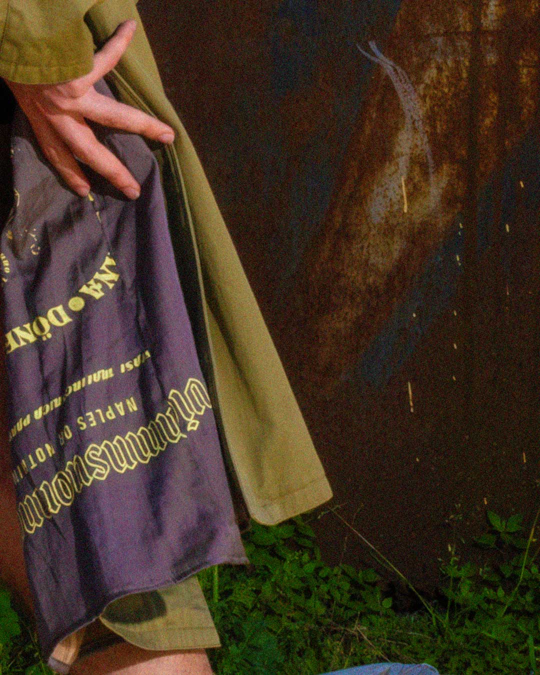 Capo customizzato, con stampa serigrafica sul retro raffigurante la madonna, patch sul fronte raffigurante un paesaggio di Napoli.