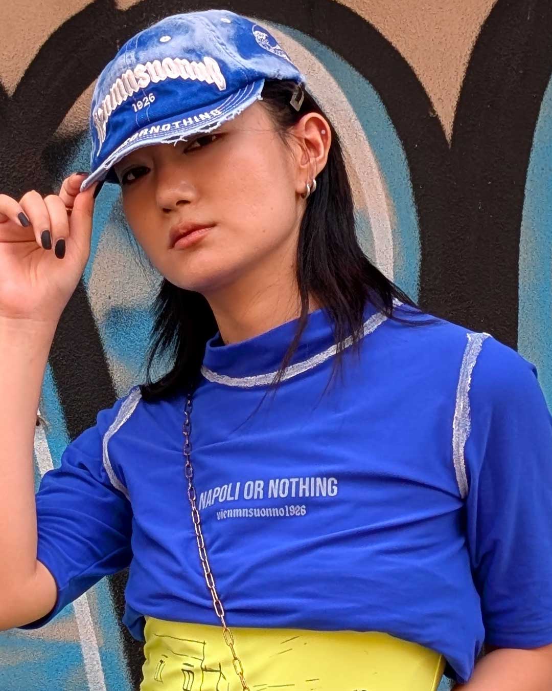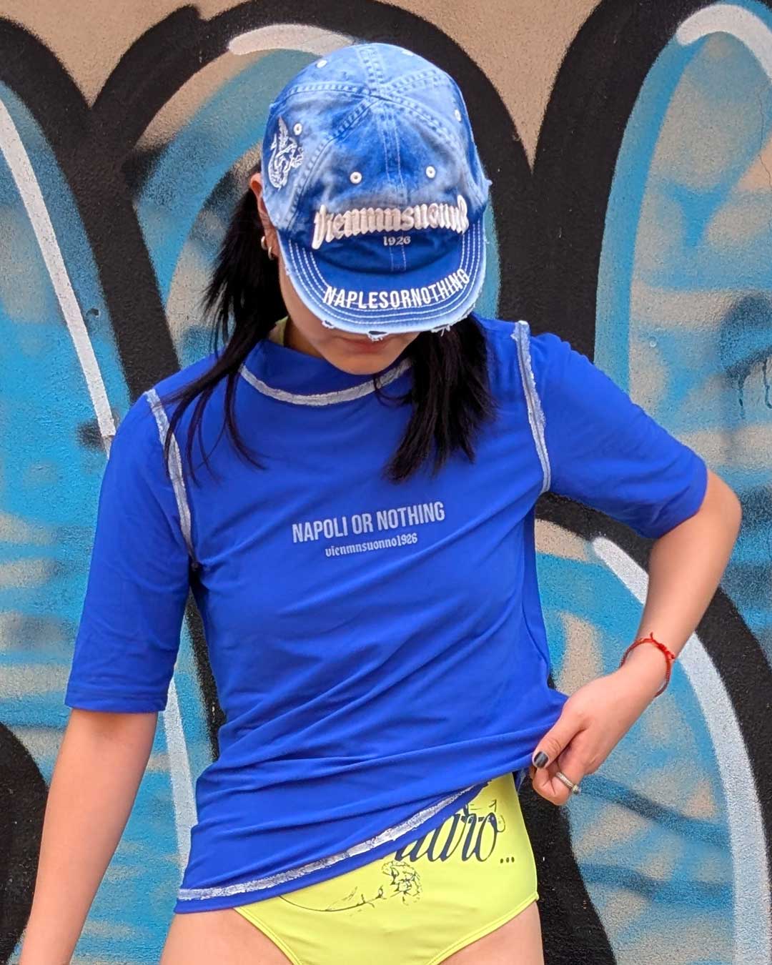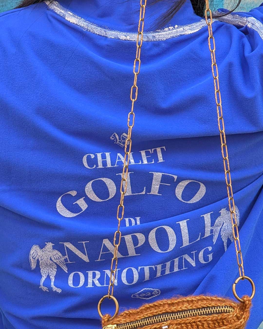 Stampa serigrafica off white sul fronte "Napoli or nothing" e sul retro "Chalet del golfo" con bordi a contrasto realizzati a mano color off white .
